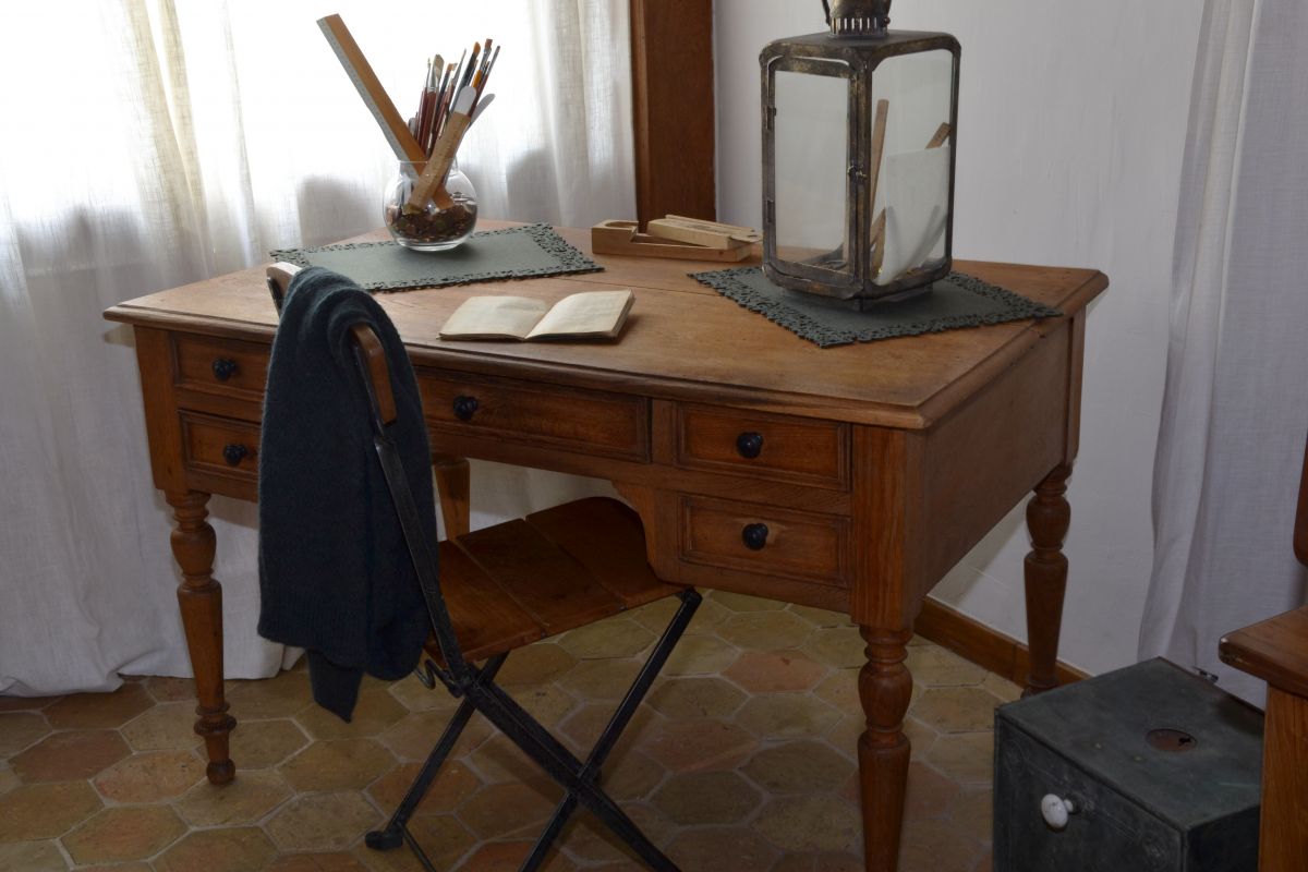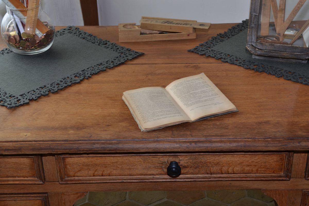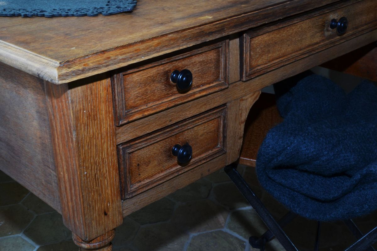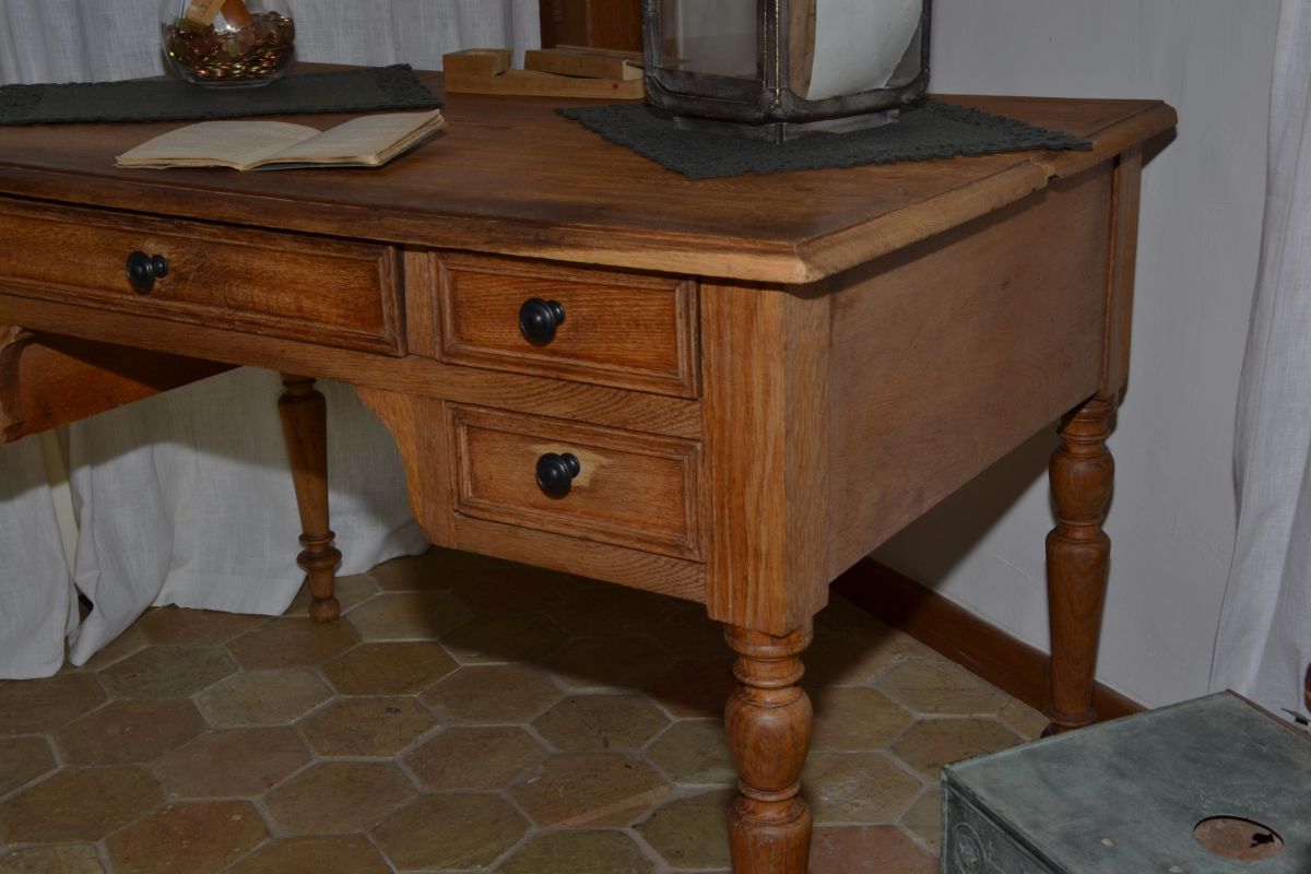 Le plateau en chêne massif, marqué par le temps nous laisse imaginer les traces de l’histoire vécue.