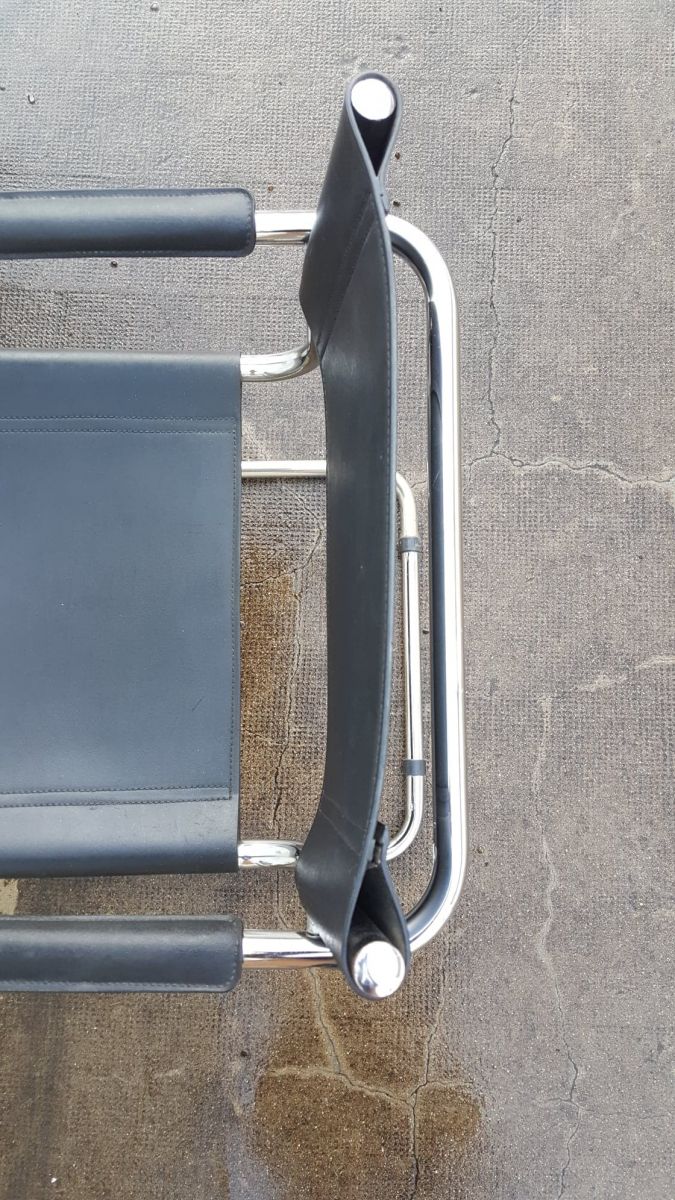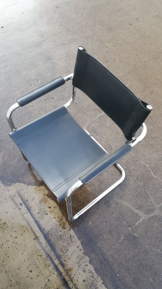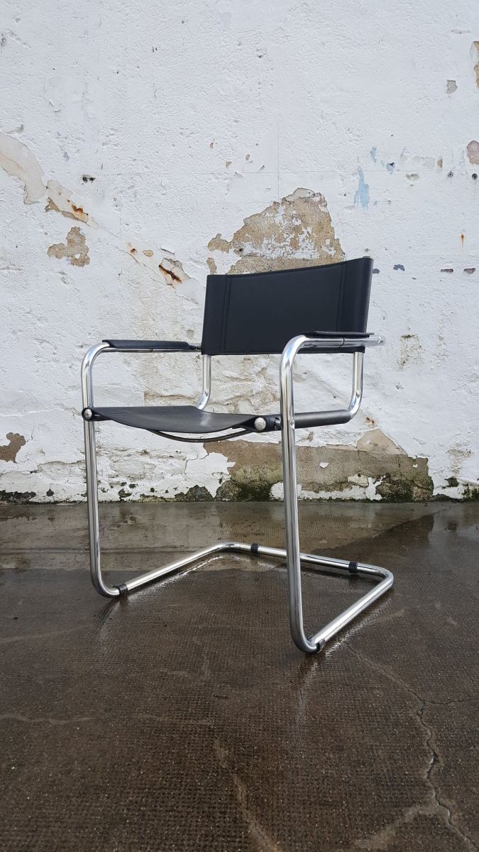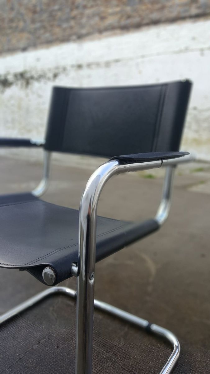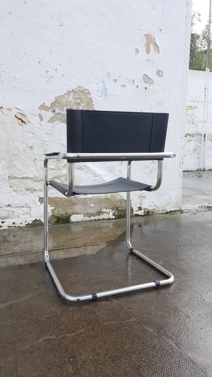 Beau fauteuil cantilever d'après le design de Marcel Breuer. Premier modèle crée en 1926 par ce pionner du Bauhaus, son intention était de réaliser une assise fonctionnelle, moderne, pratique et surtout légère et facile à déplacer. Un vrai succès moderniste et futuriste qui reste intemporel dans nos intérieurs même 100 ans après sa création. Matériaux: structure en acier tubulaire chromé brillant avec une assise et un dossier en cuir renforcé. En très bon état. Dimension: hauteur assise 44; hauteur dossier 80; largeur 58; profondeur 54.