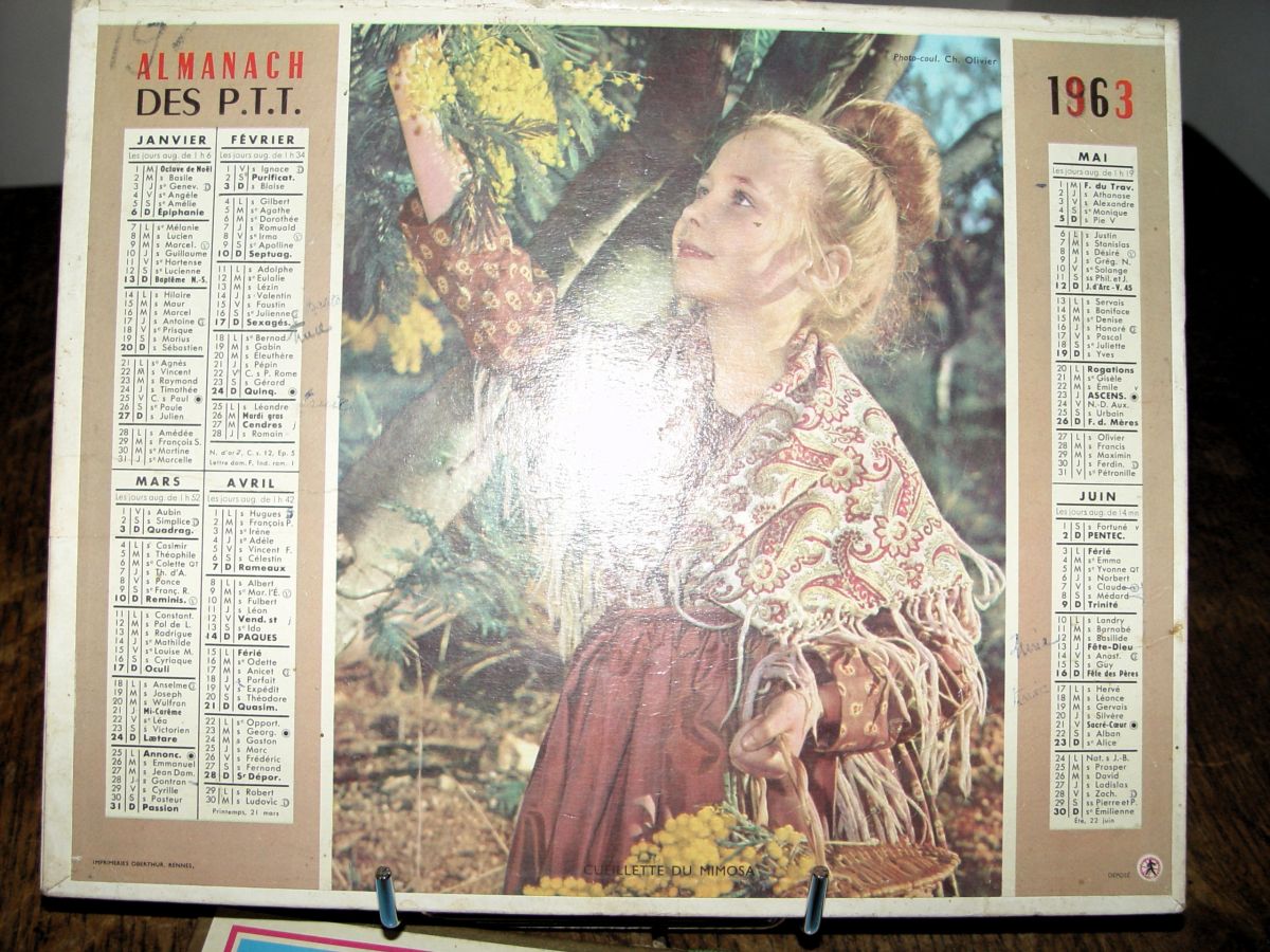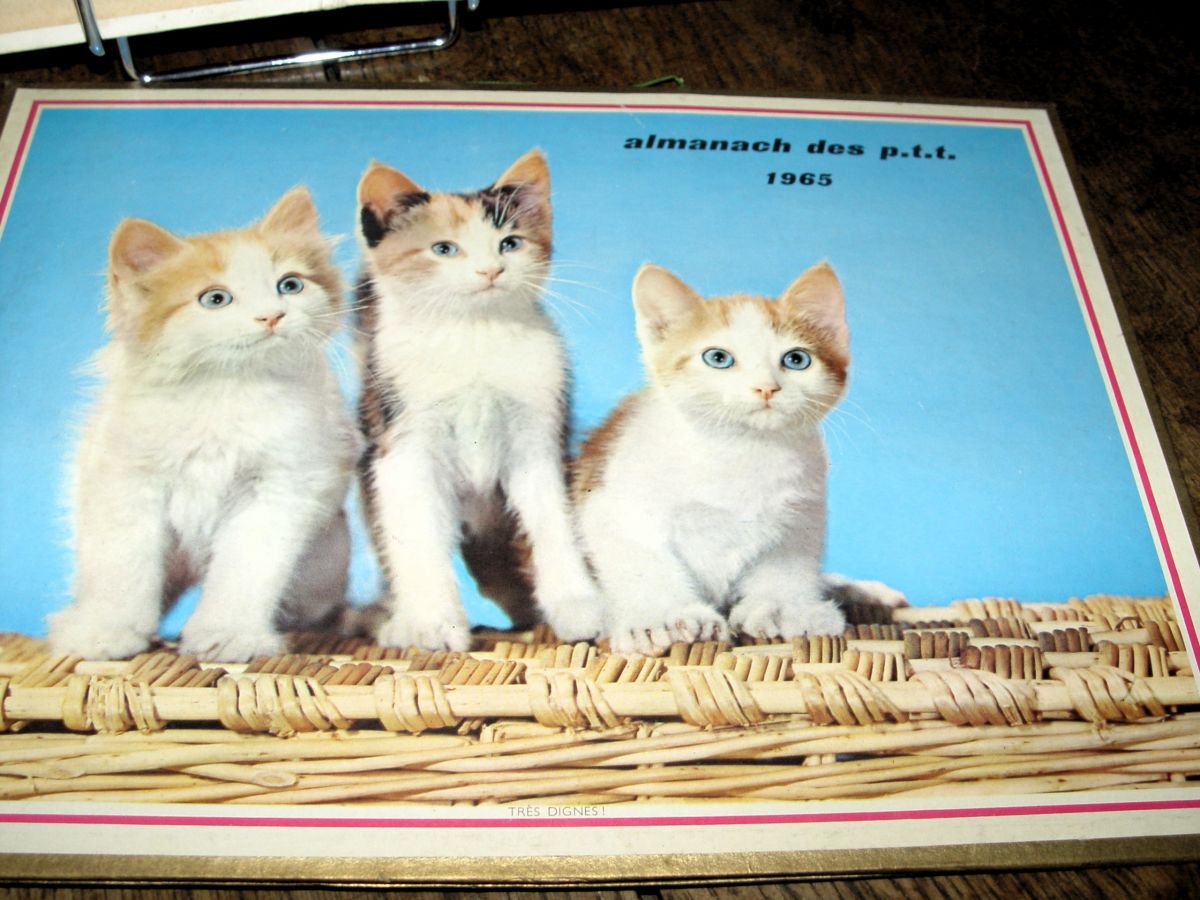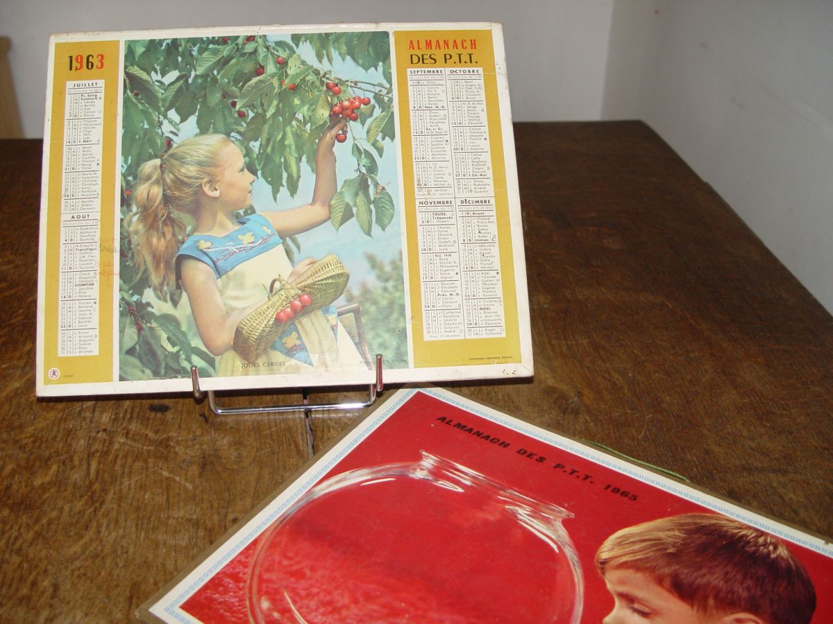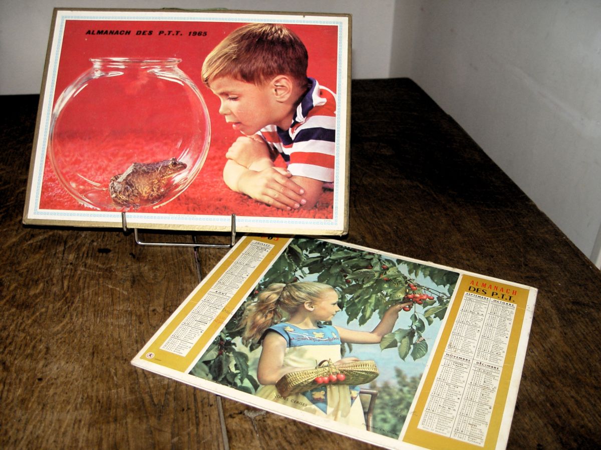 Lot de 2 almanachs PTT de 1963 et 1965 avec images recto/verso ("Jolies cerises"/ "Cueillette du mimosa" & "Chatons très dignes"/ "L'enfant à la grenouille") mais incomplet à l'intérieur (seulement la couverture).