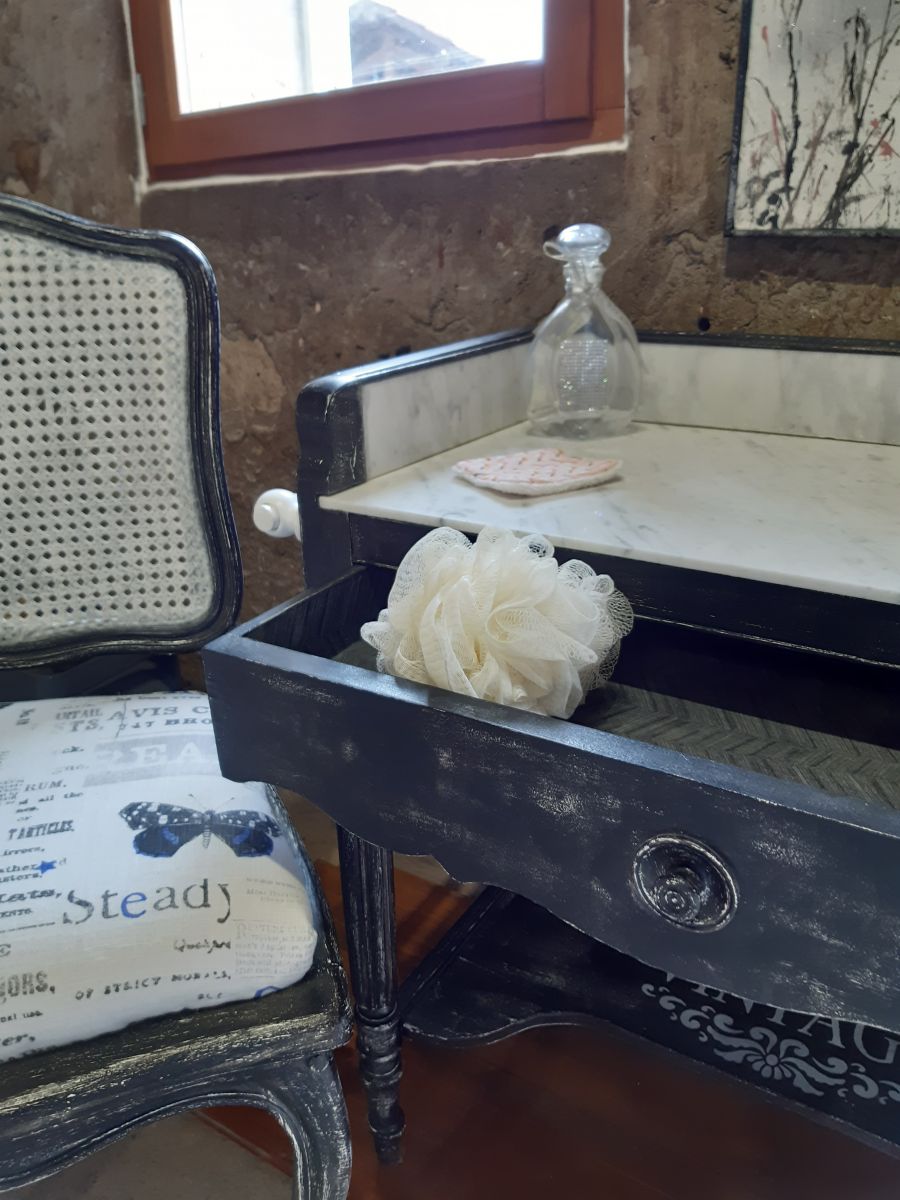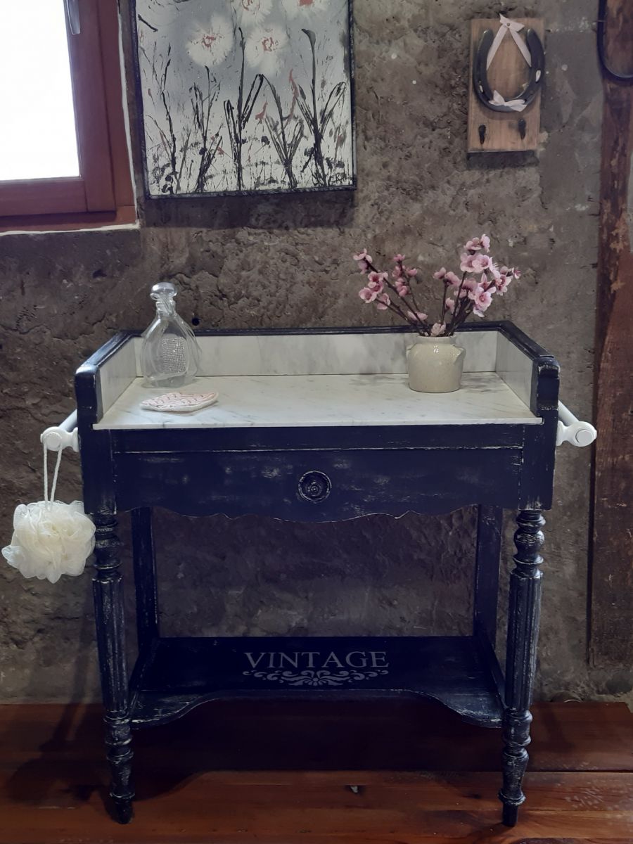 table de toilette vintage, dessus marbre, relookée patine en noir et blanc