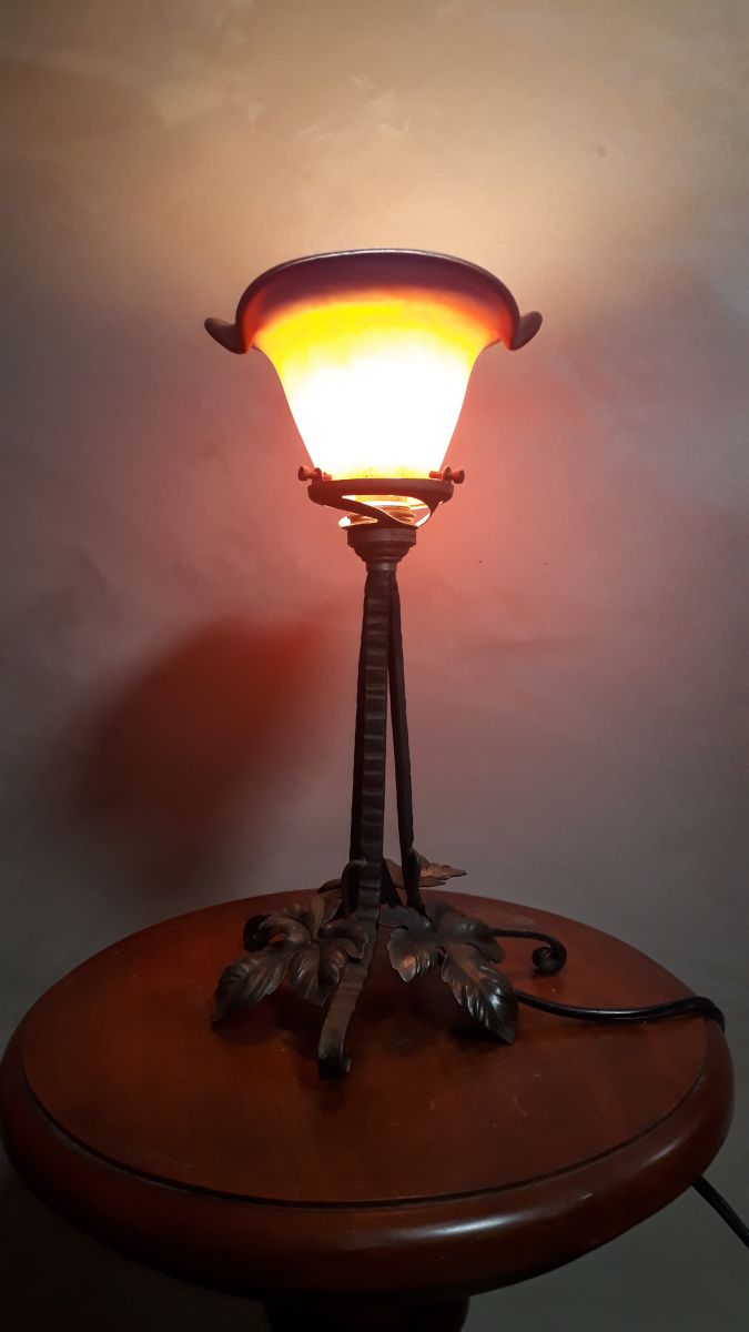 lampe 1930 fer forge tulipe pate de verre signee