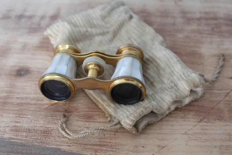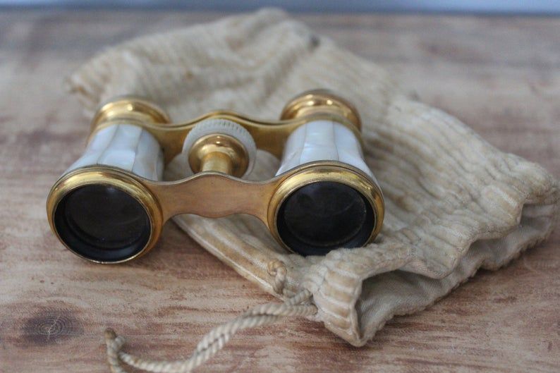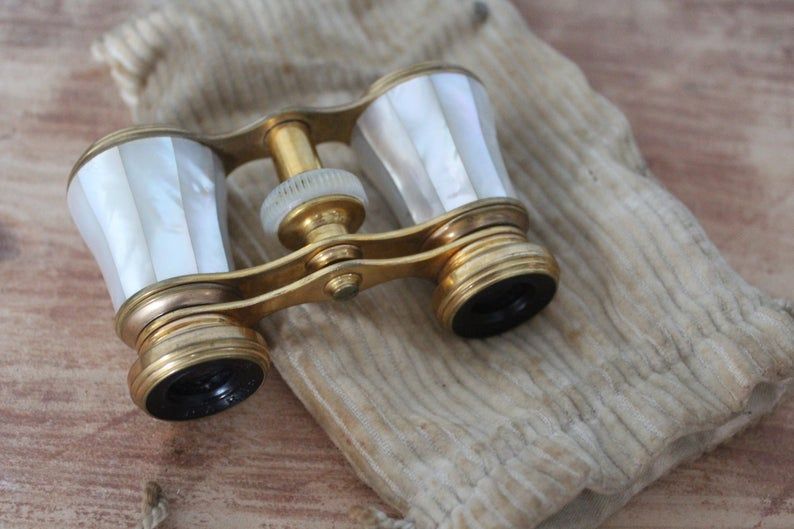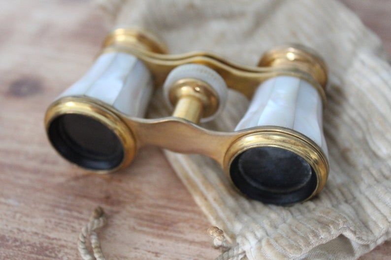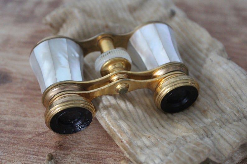 Magnifique paire de jumelles en nacre et en bronze vendue dans son écrin.