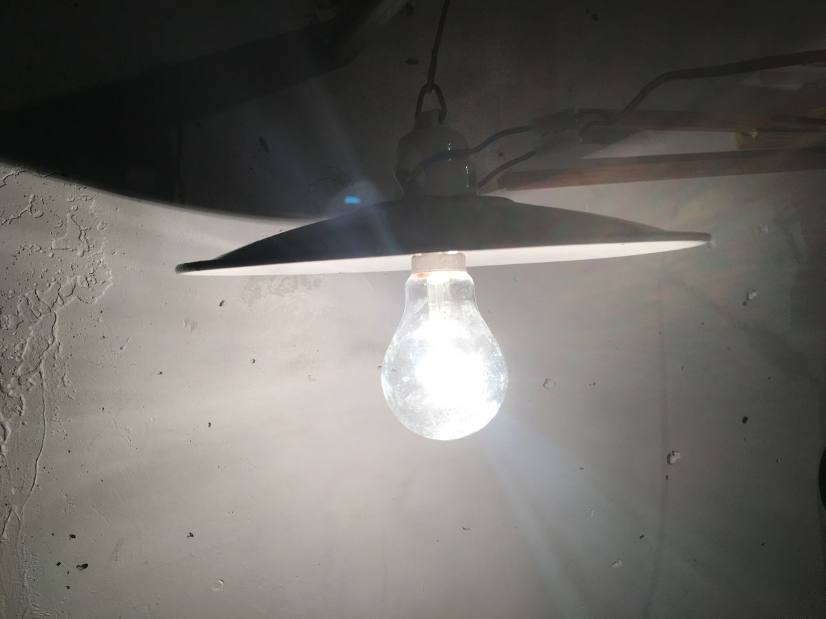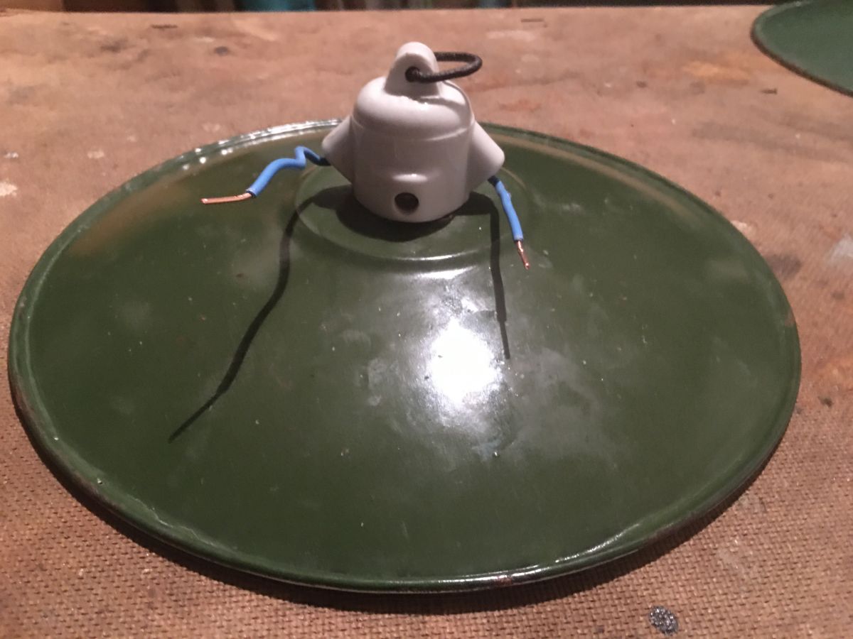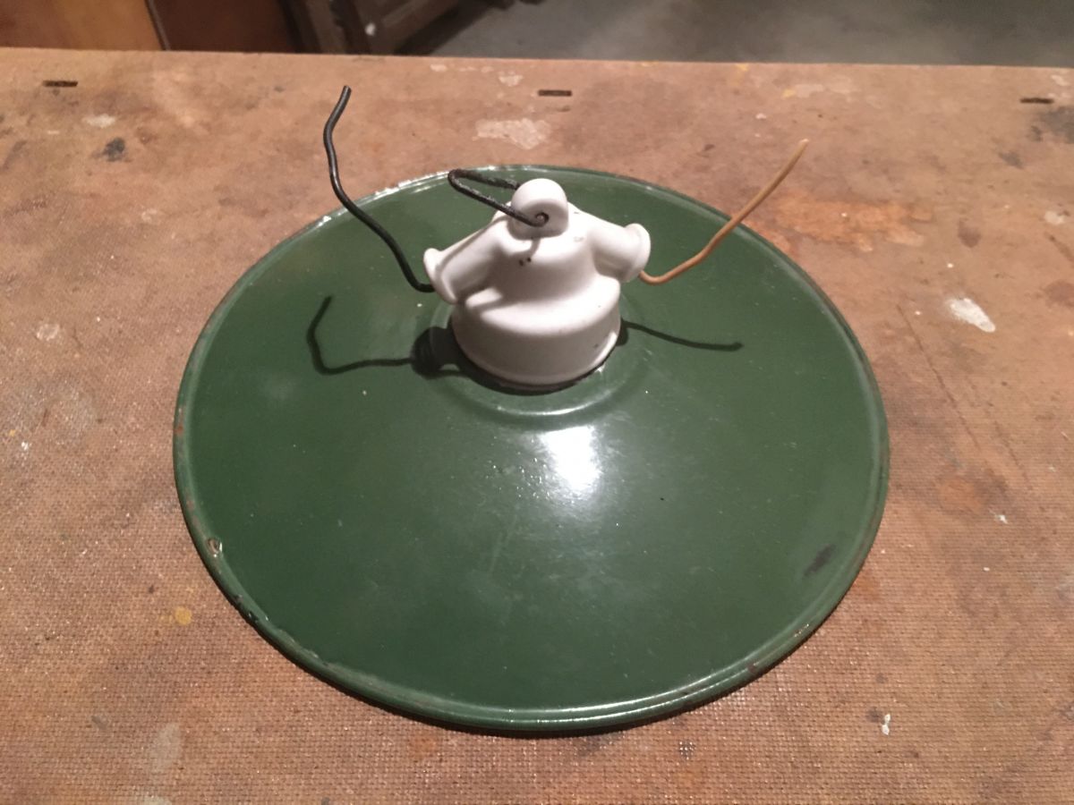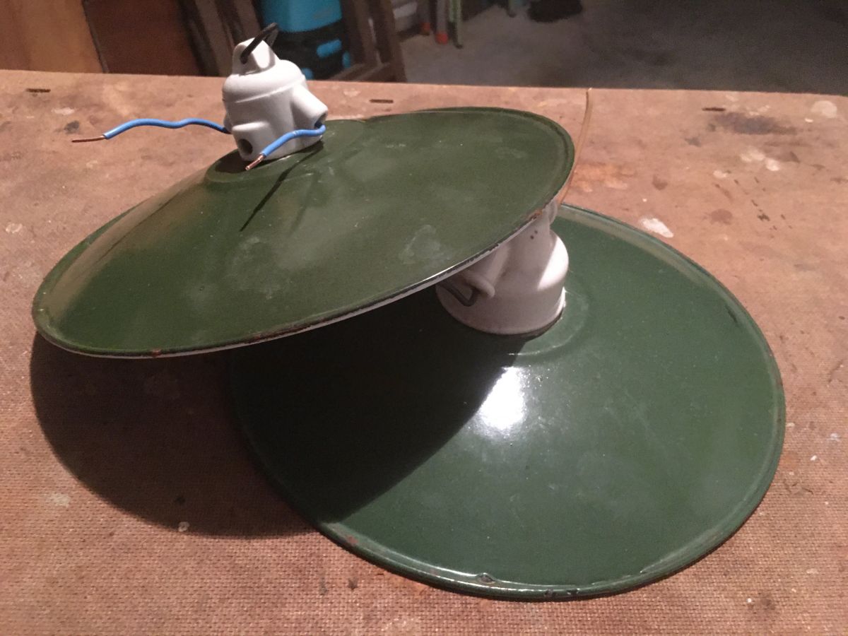 Lot de deux suspensions gamelles industrielles des années 50 en tôle émaillée verte, quelques éclats (voir photos) qui contribuent au vécu et au charme de la lampe, parfait état de marche, hauteur 7cm, diamètre 24cm, douille en porcelaine, fil électrique changé, bon état.