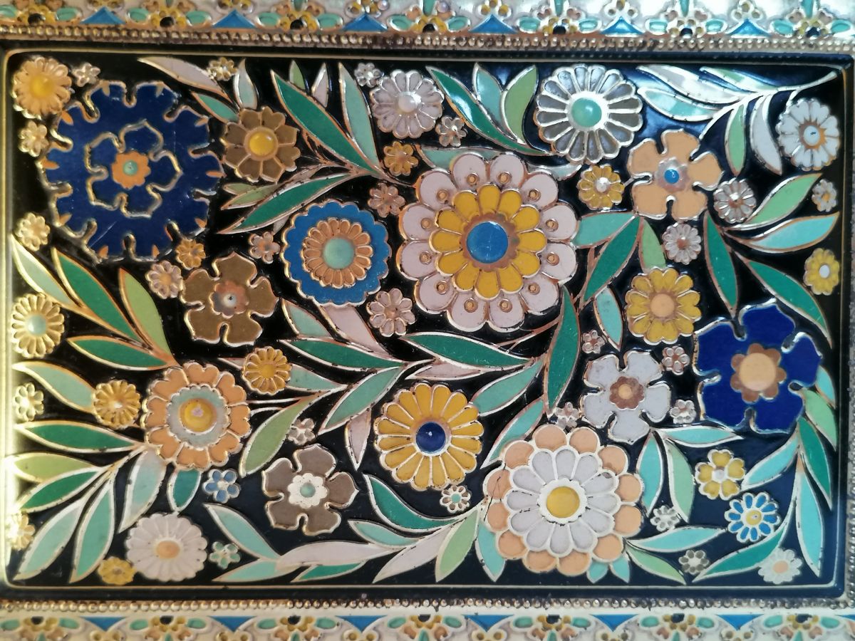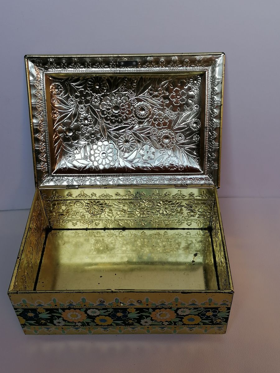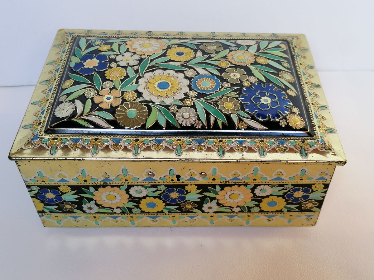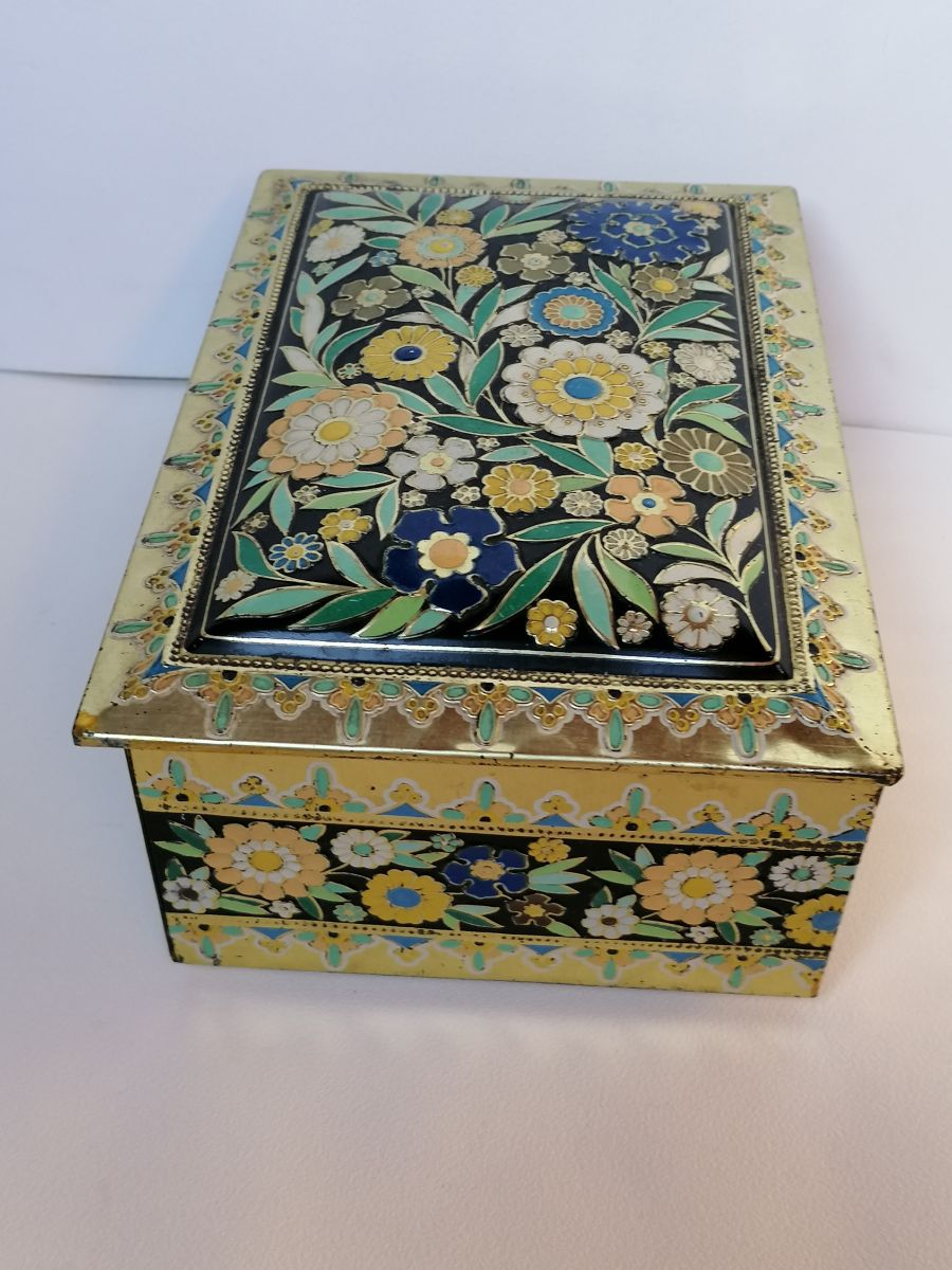 Jolie boîte ancienne en tôle peinte de motifs floraux. Quelques traces d'usage. Très bon état.