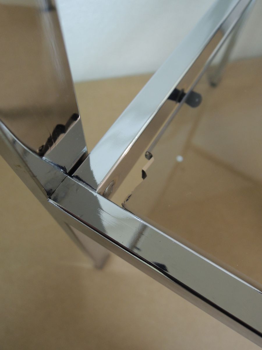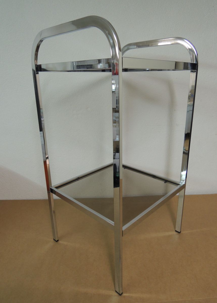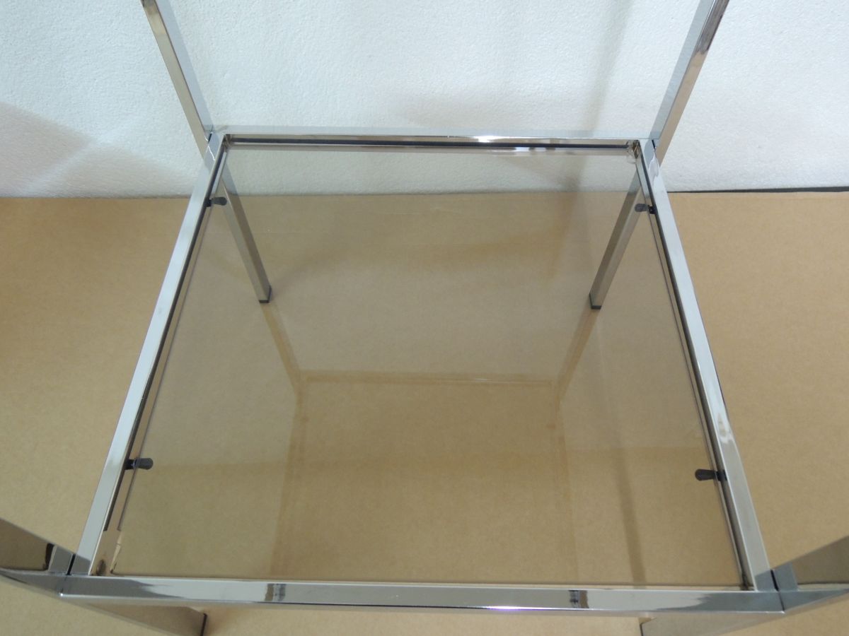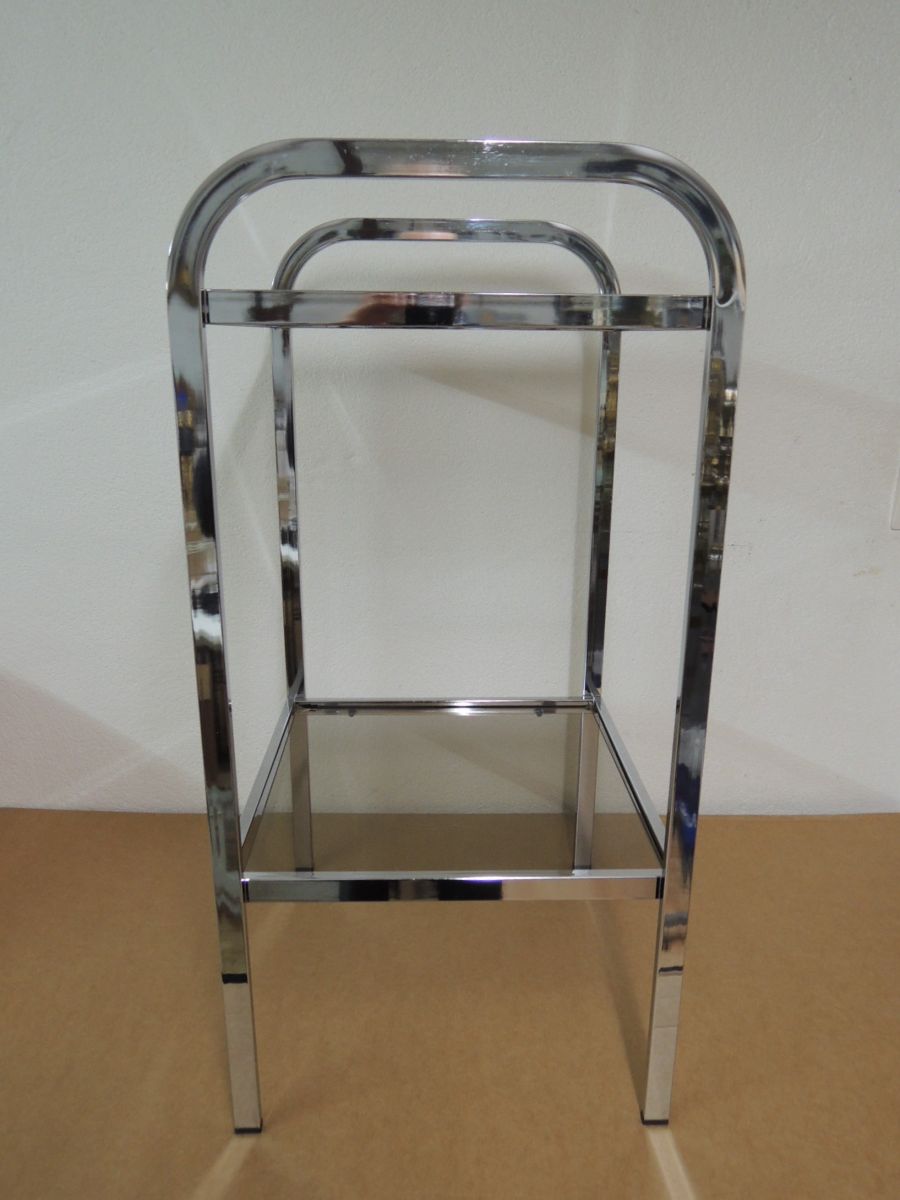 Table année 70-80 en métal chromé, profilé rectangulaire de 20x10 mm. Deux tablettes carrées 31.5x31.5 cm en verre fumé et chants polis, épaisseur 5 mm. Embouts de pieds et chrome en bon état, un éclat dans un angle sur la tablette du bas (voir dernière photo).