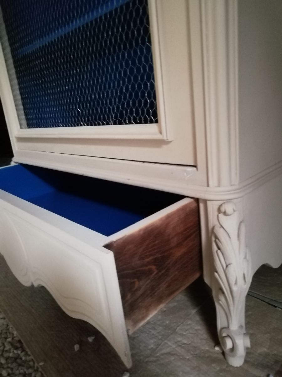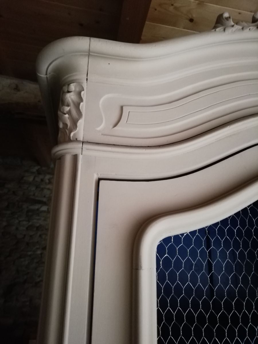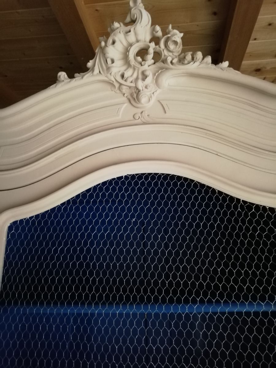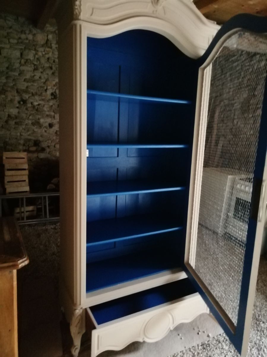 Bonnetière rocaille revisitée. Peinture extérieure Libéron couleur champignon et intérieure bleu de Bretagne. Grillage sur la porte. Traitement insecticide.