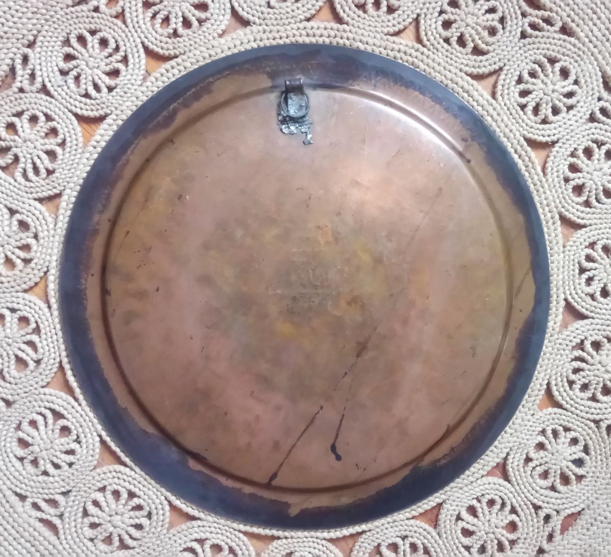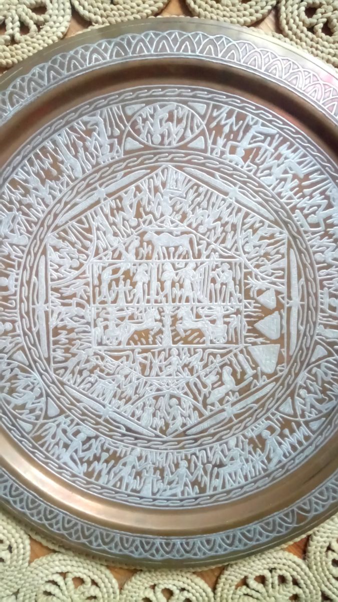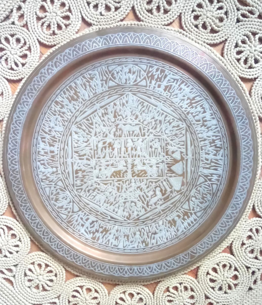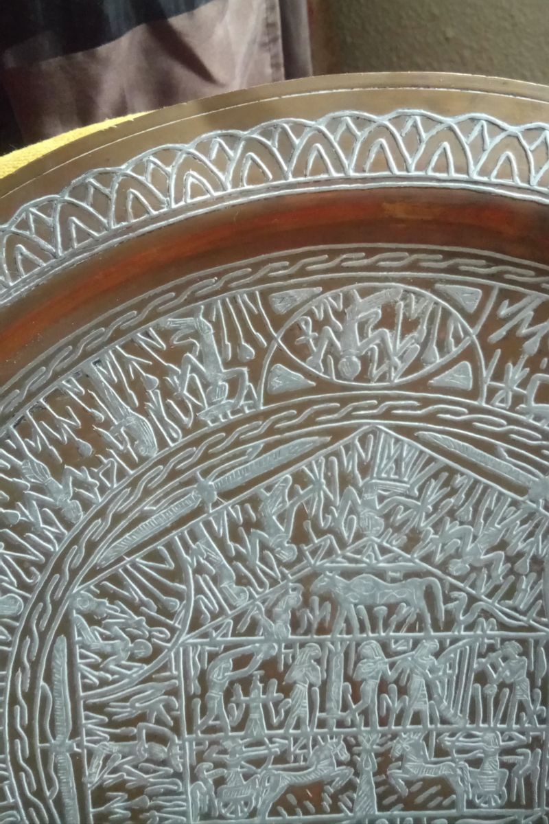 Ancien plateau de service ou plateau de table à thé en cuivre gravé (scènes de vie quotidiennes égyptiennes)