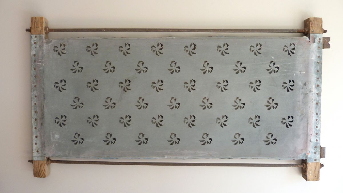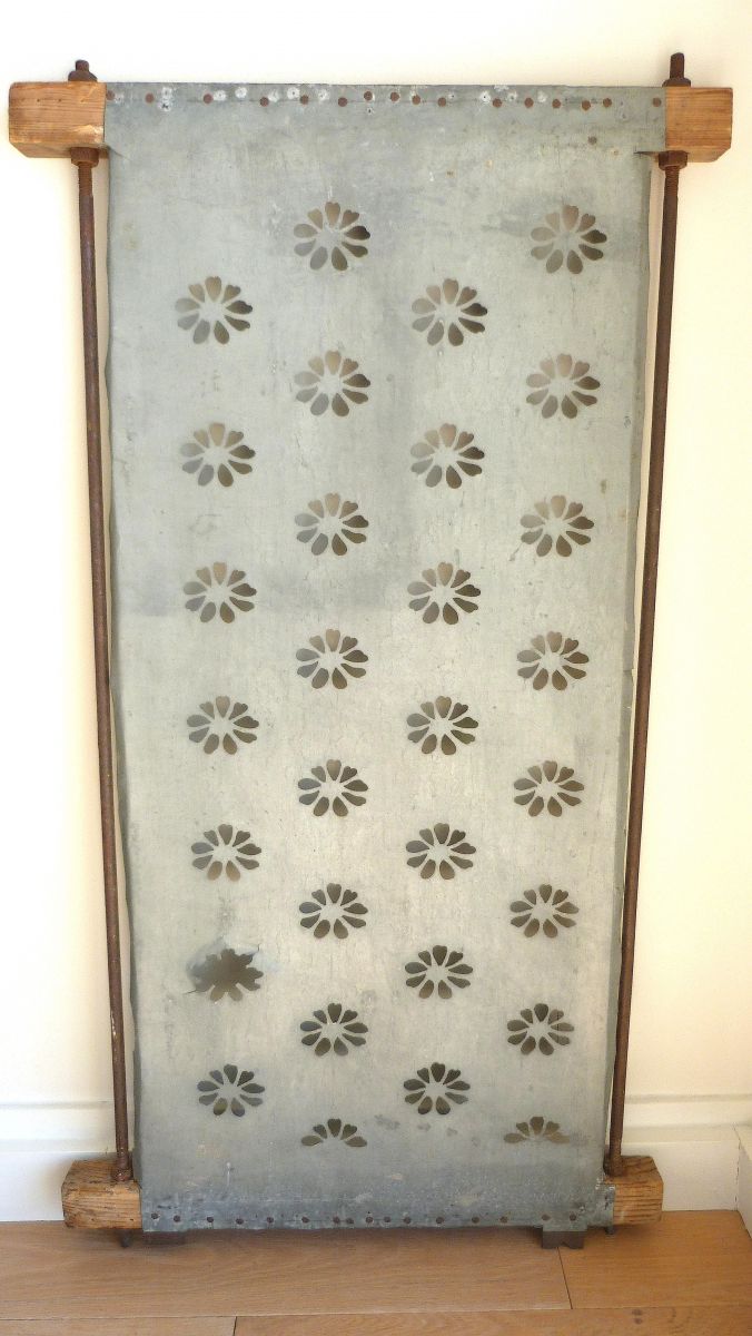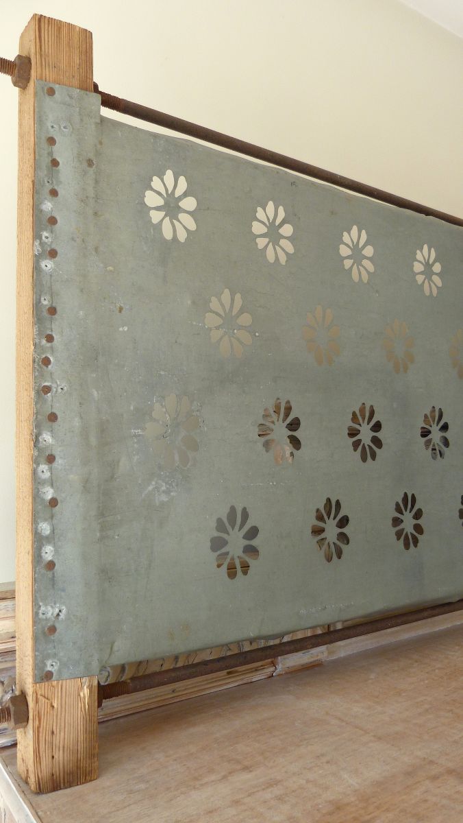 Plaque zinc, métal et bois. Servait à l'origine à faire de jolies fleurs au pochoir.