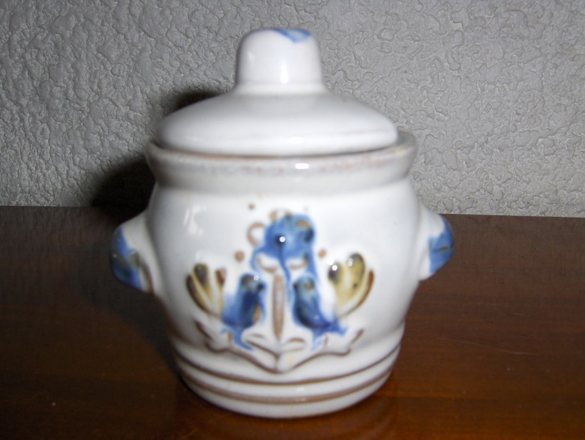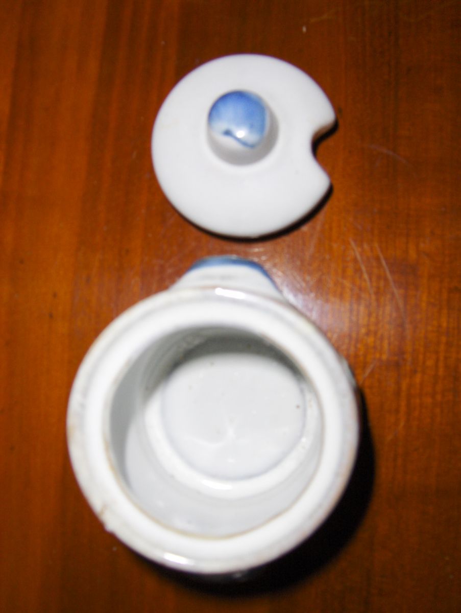 Ancien petit pot à moutarde en faïence bleu et blanc motif d'oiseaux.