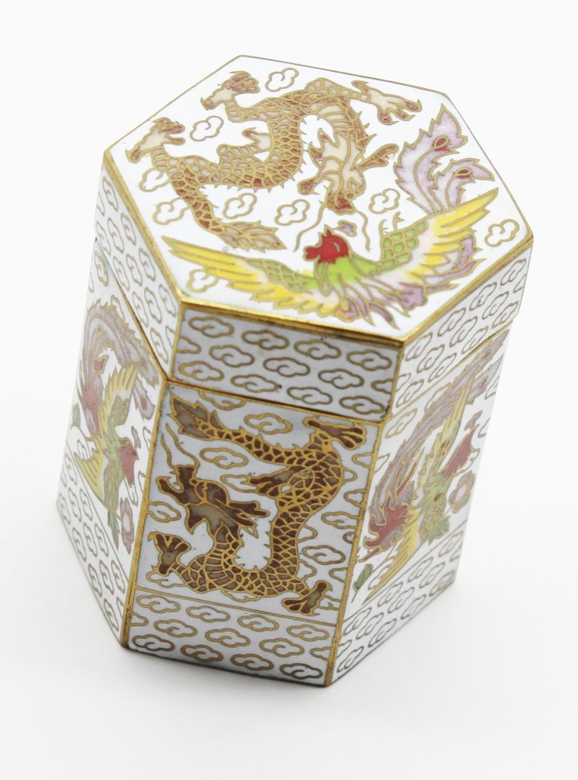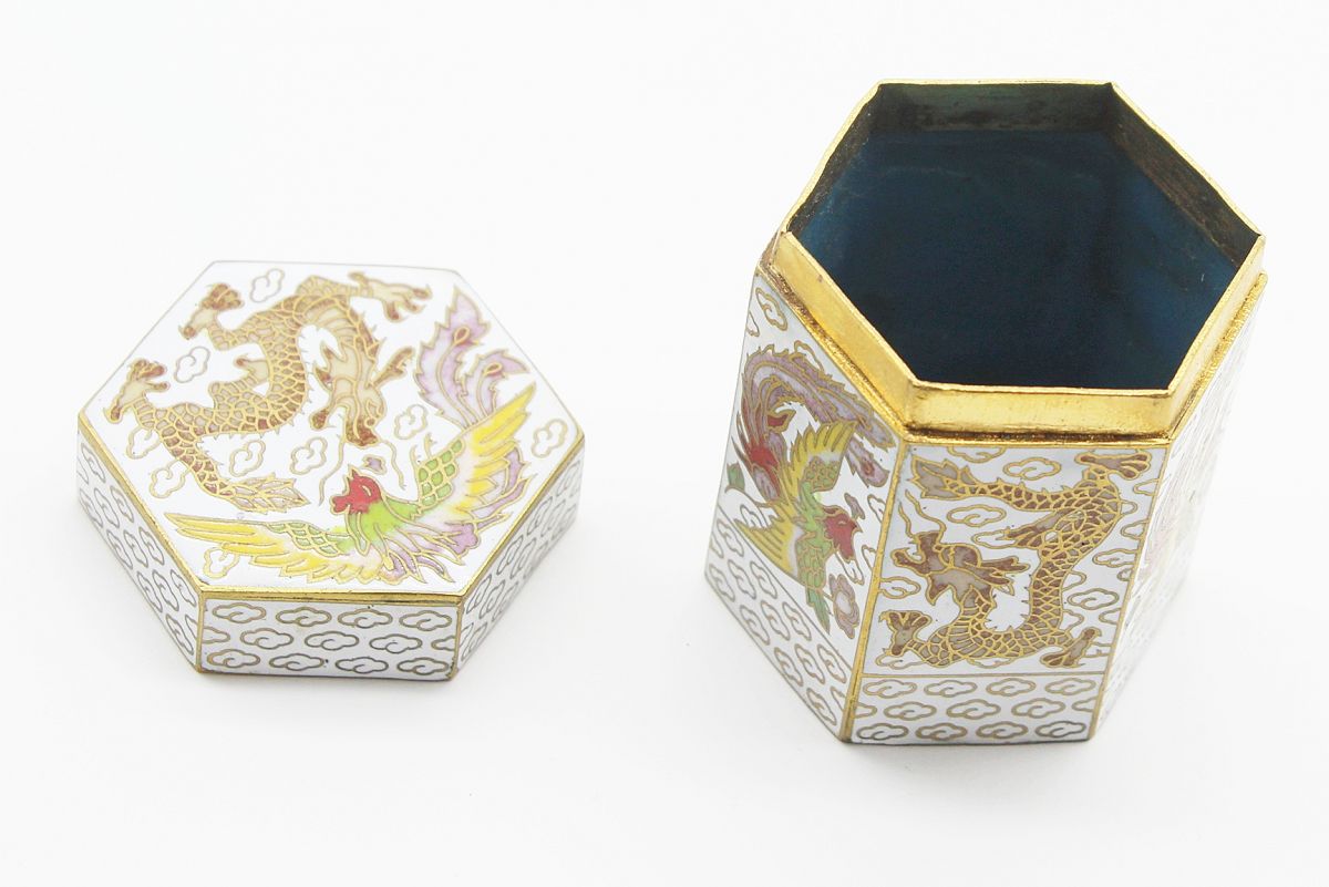Boite cloisonnée chinoise avec dragon des années 80 en bon état vendue avec sa boîte d'origine.