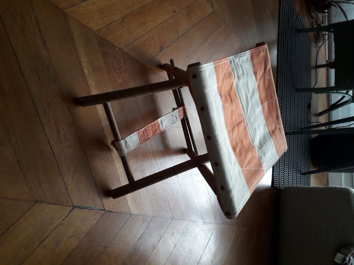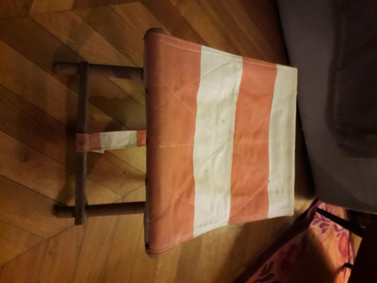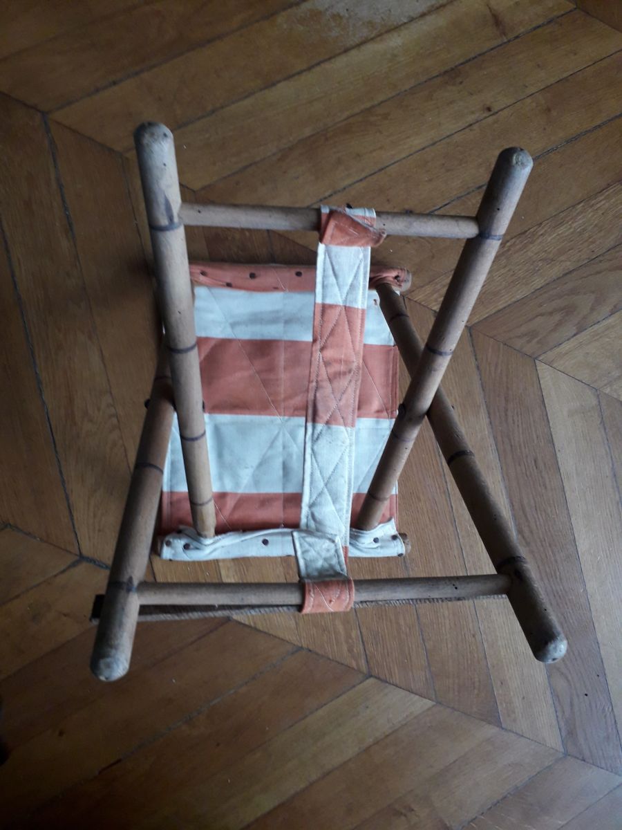 Tabouret pliant des années 50. La structure est en bois avec l'assise en toile rayée.