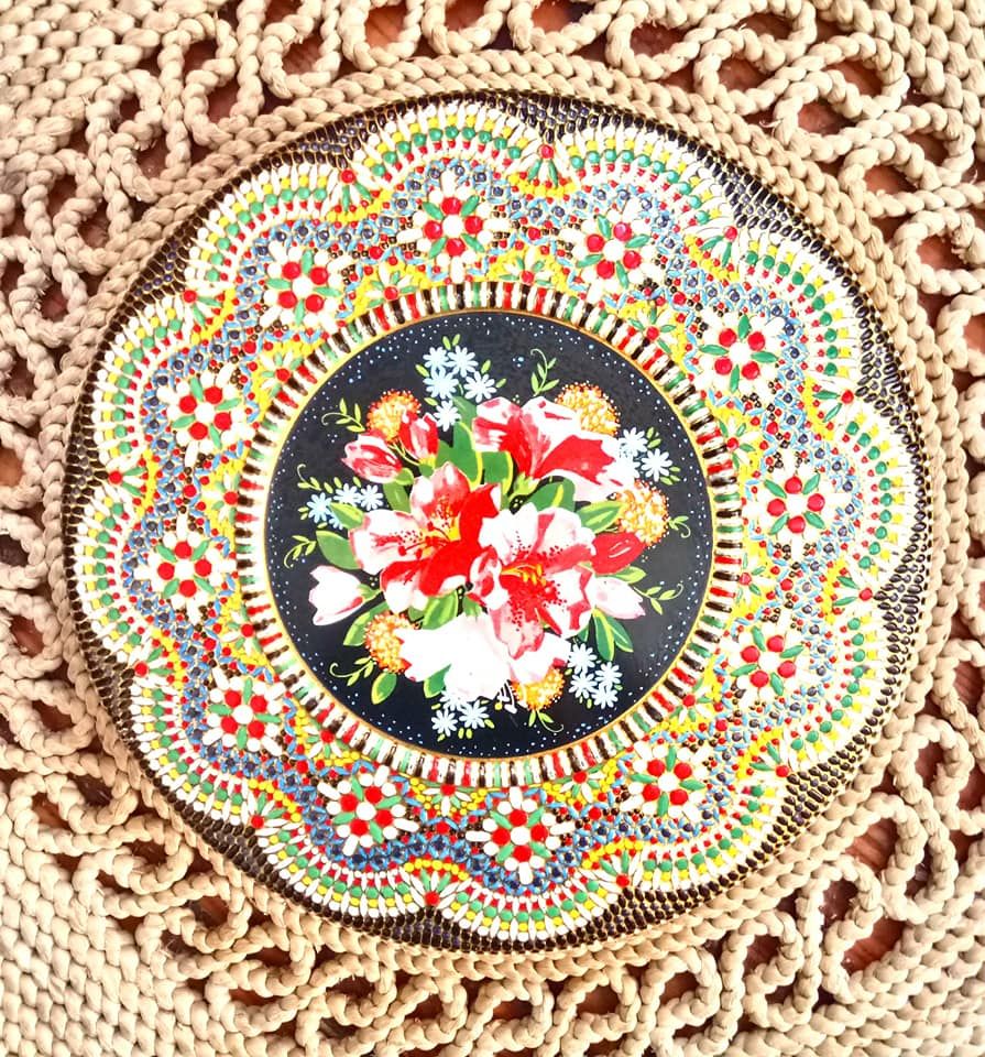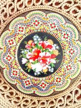 Décor fleuri en médaillon et mosaïques cloisonnées et très colorées