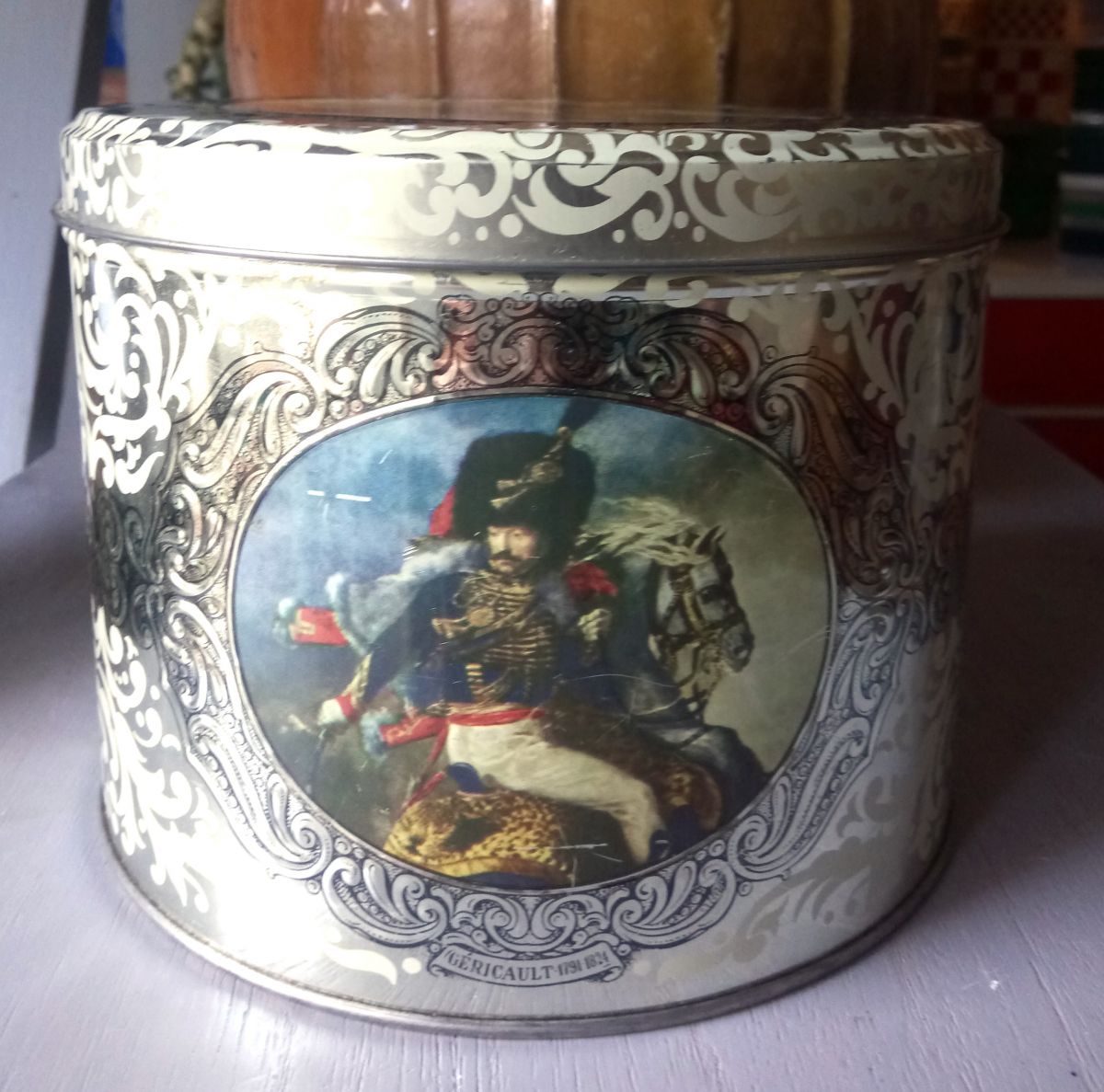 Ancienne boîte à biscuits en tôle lithographiée avec des portraits de peintres célèbres en médaillon (Géricault, Rigaud ...)