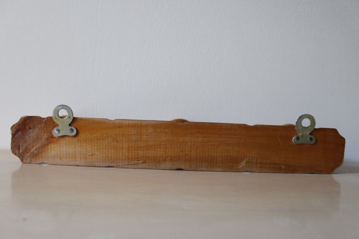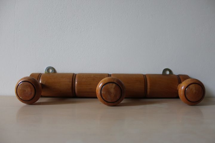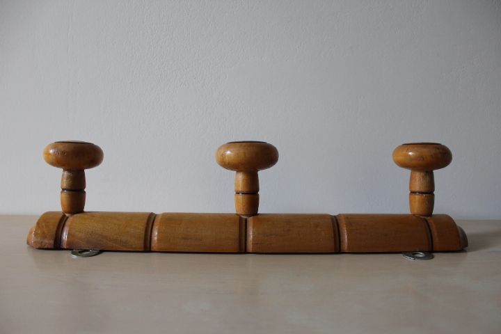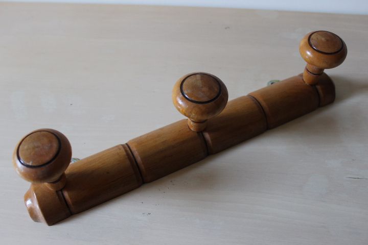 Portemanteau ancien 3 têtes, en bois tourné imitation bambou et d’une jolie couleur miel soulignée de liserés noirs. Il est en très bon état vintage. Pourvu des deux attaches métalliques, il est prêt à accrocher au mur.