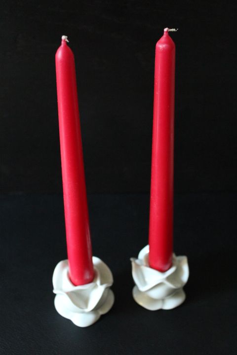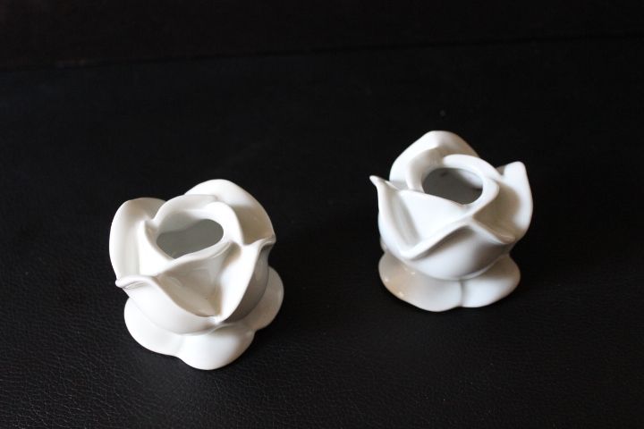 Ensemble de deux anciens bougeoirs en porcelaine blanche ayant une forme de rose, dont l’un des deux a un petit manque (cf. photo). Ils sont fournis avec deux chandelles rouges, pour une ambiance raffinée et romantique.