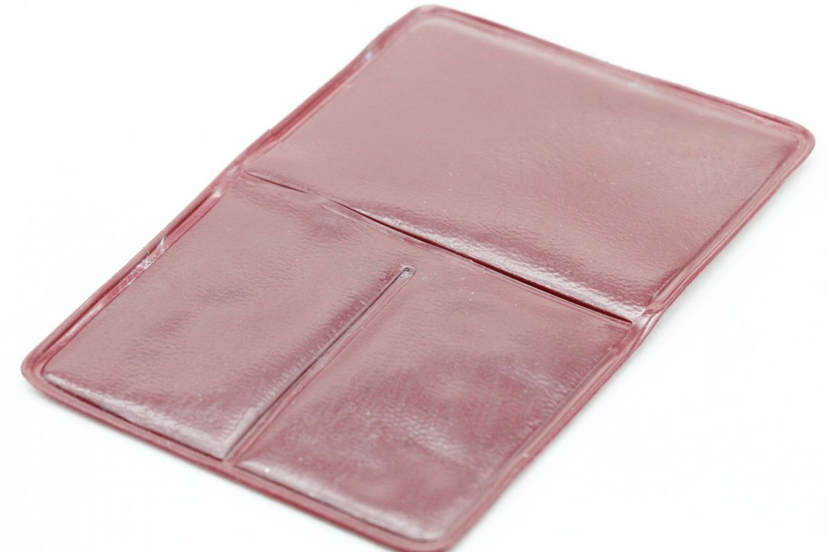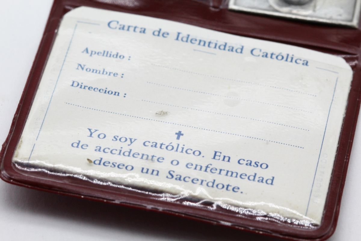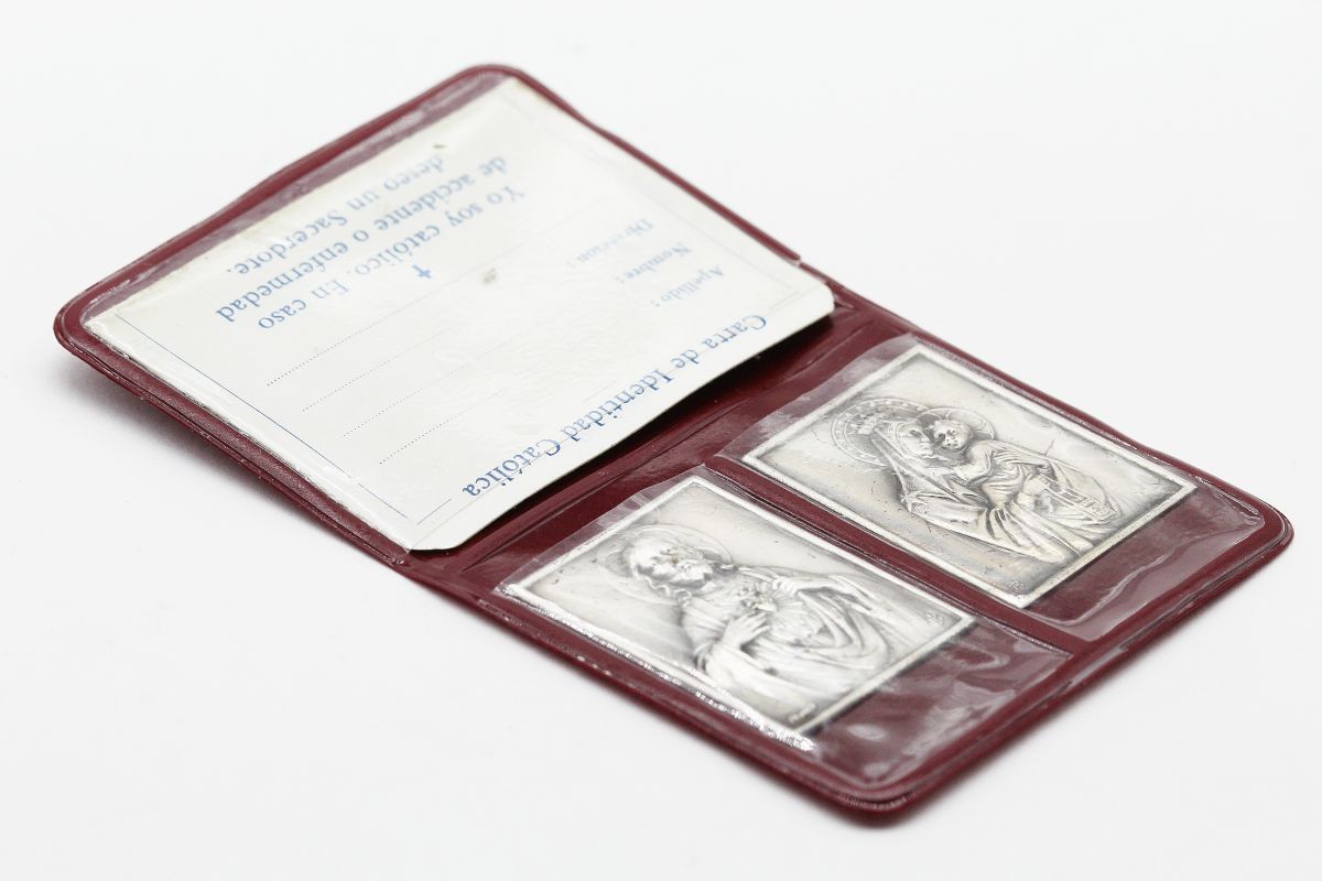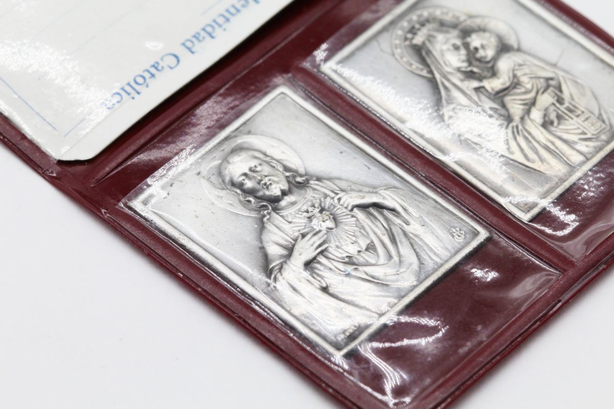 Ancienne pochette catholique avec des plaques religieuses de la vierge marie et Jésus Christ et une carte d'identité catholique.