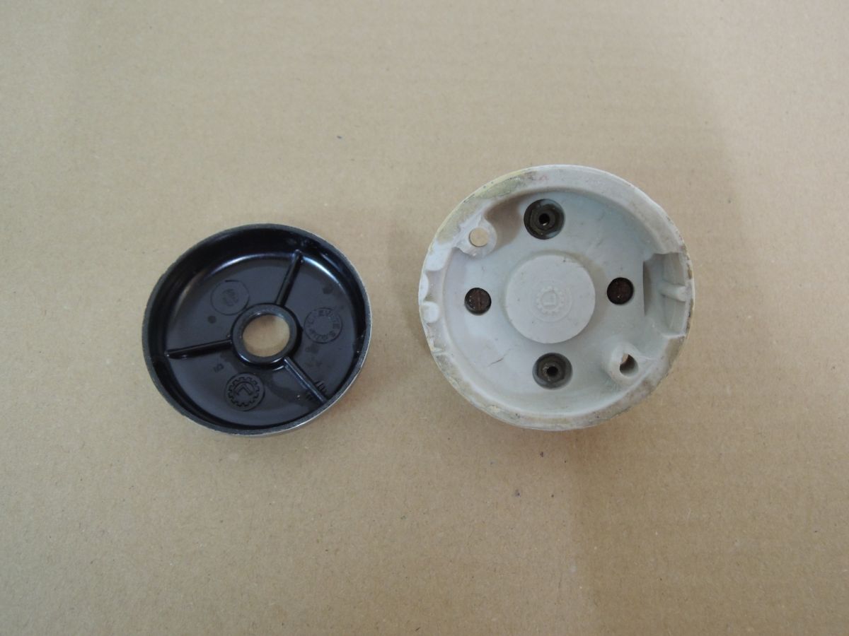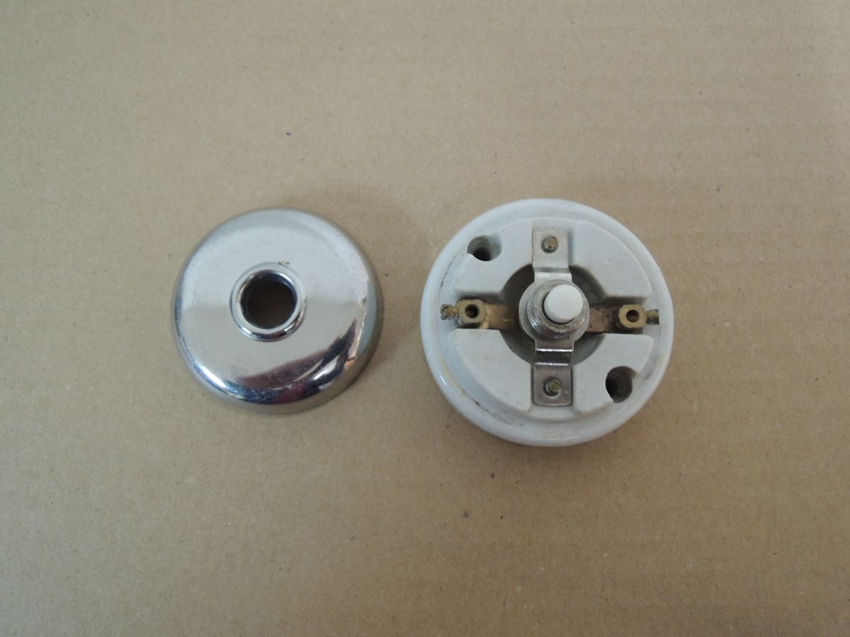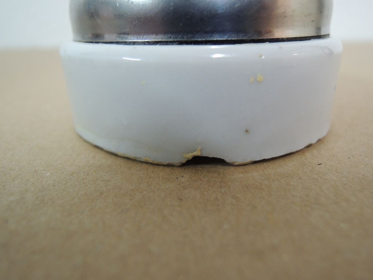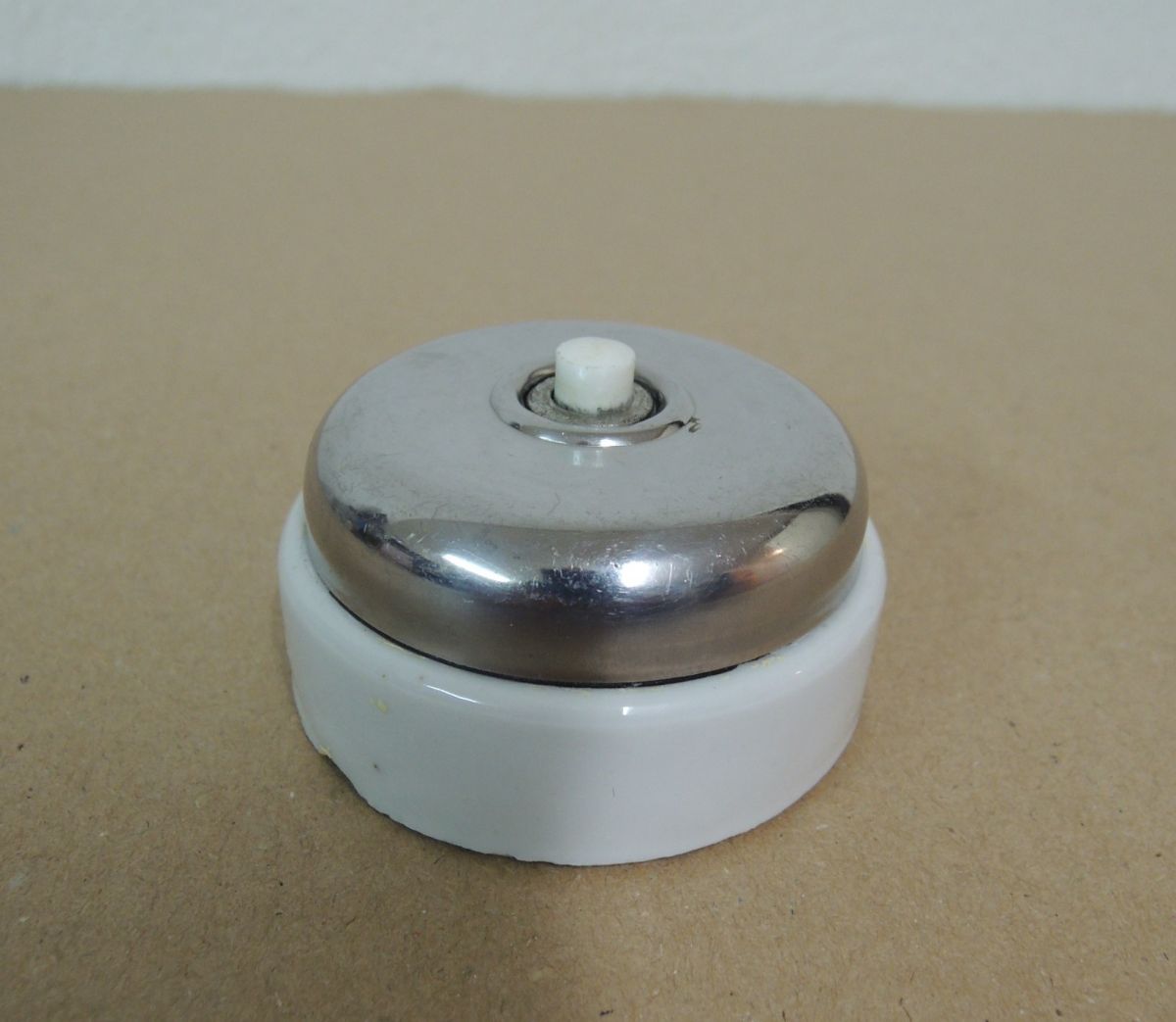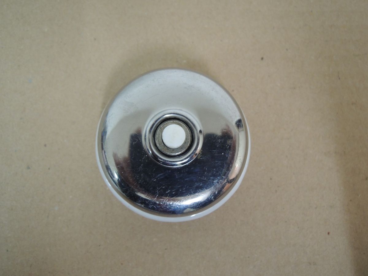 Bouton de sonnette avec base céramique et coupelle en métal chromé, avec habillage intérieur en bakélite. Traces d'usure normale et un petit éclat sur la périphérie extérieure de la base (invisible en l'orientant vers le bas).