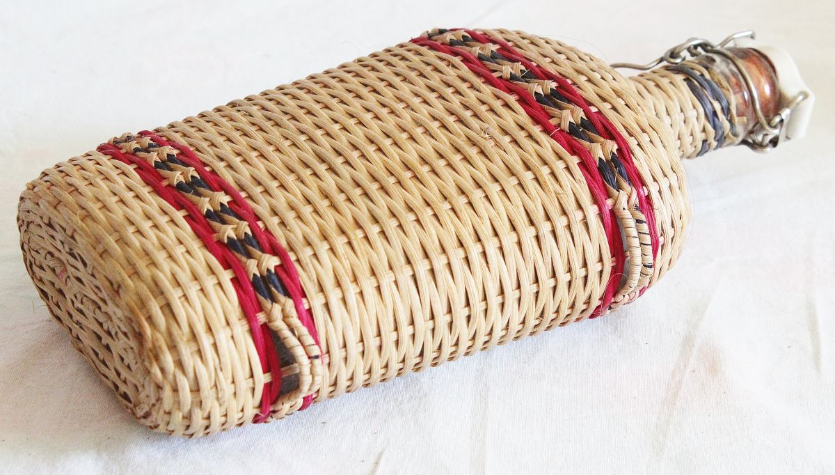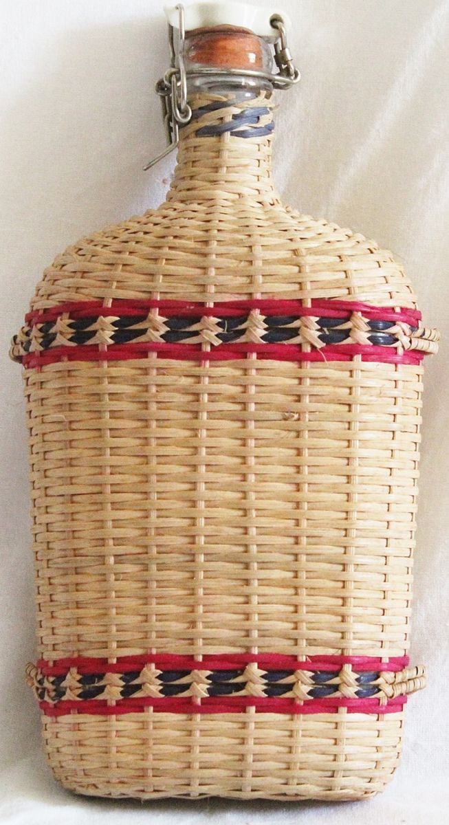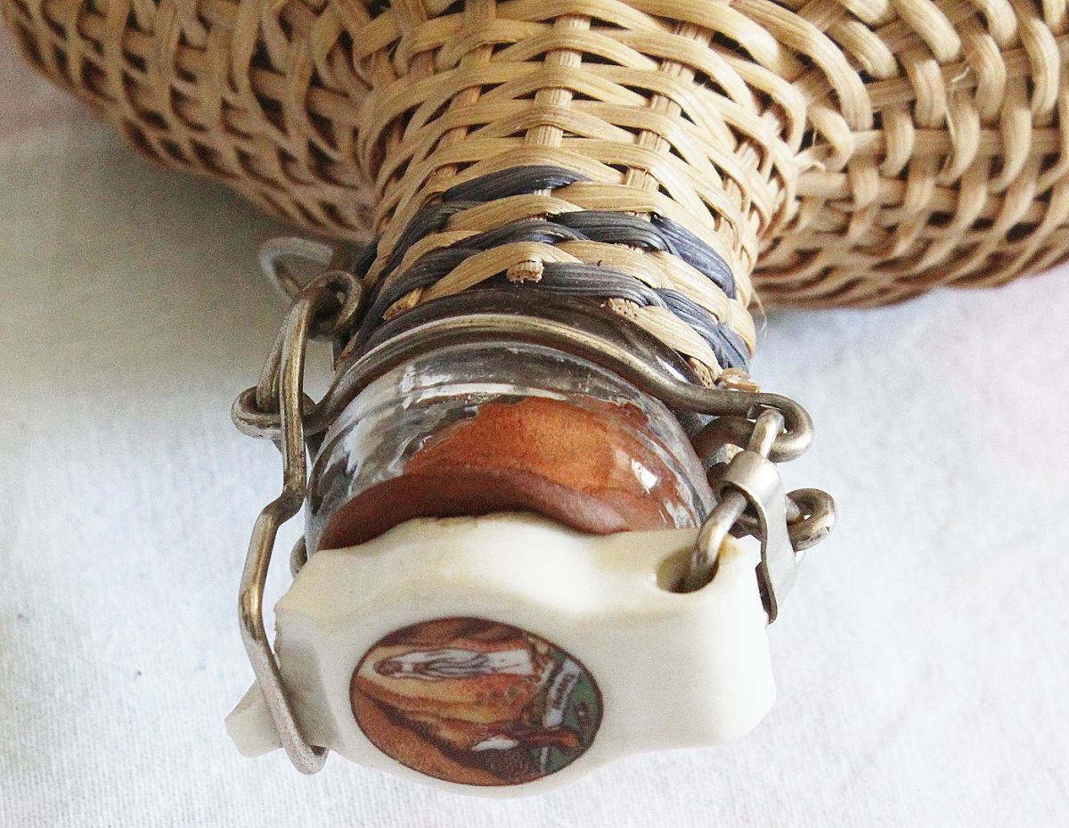 Bouteille en osier religieuse avec bouchon en porcelaine représentant la grotte de Lourdes.