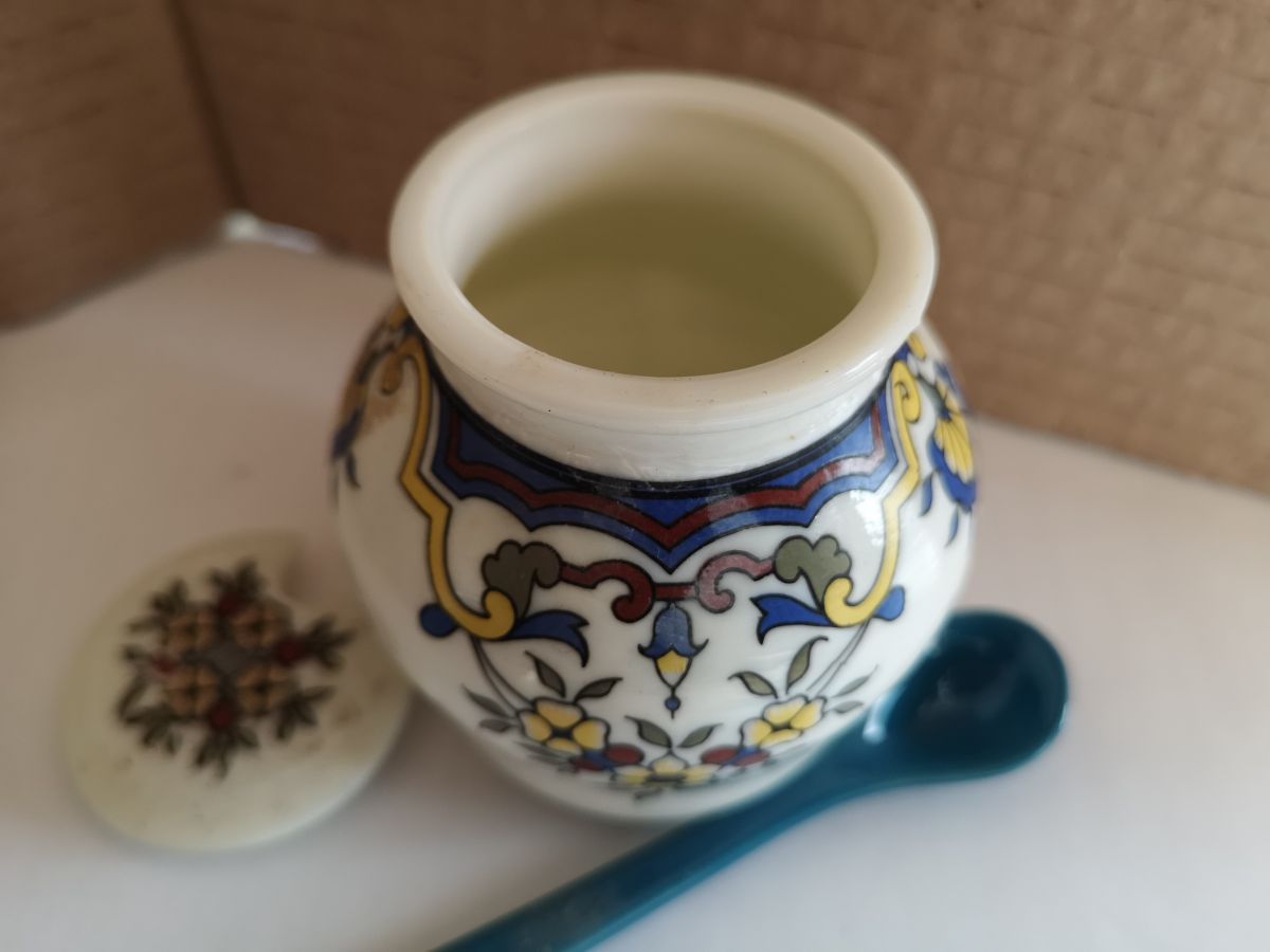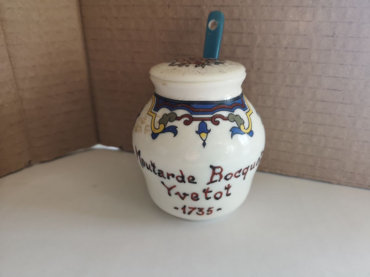 ancien moutardier en ceramique de marque bocquet yvetot 9 cm de haut et en très bon état .