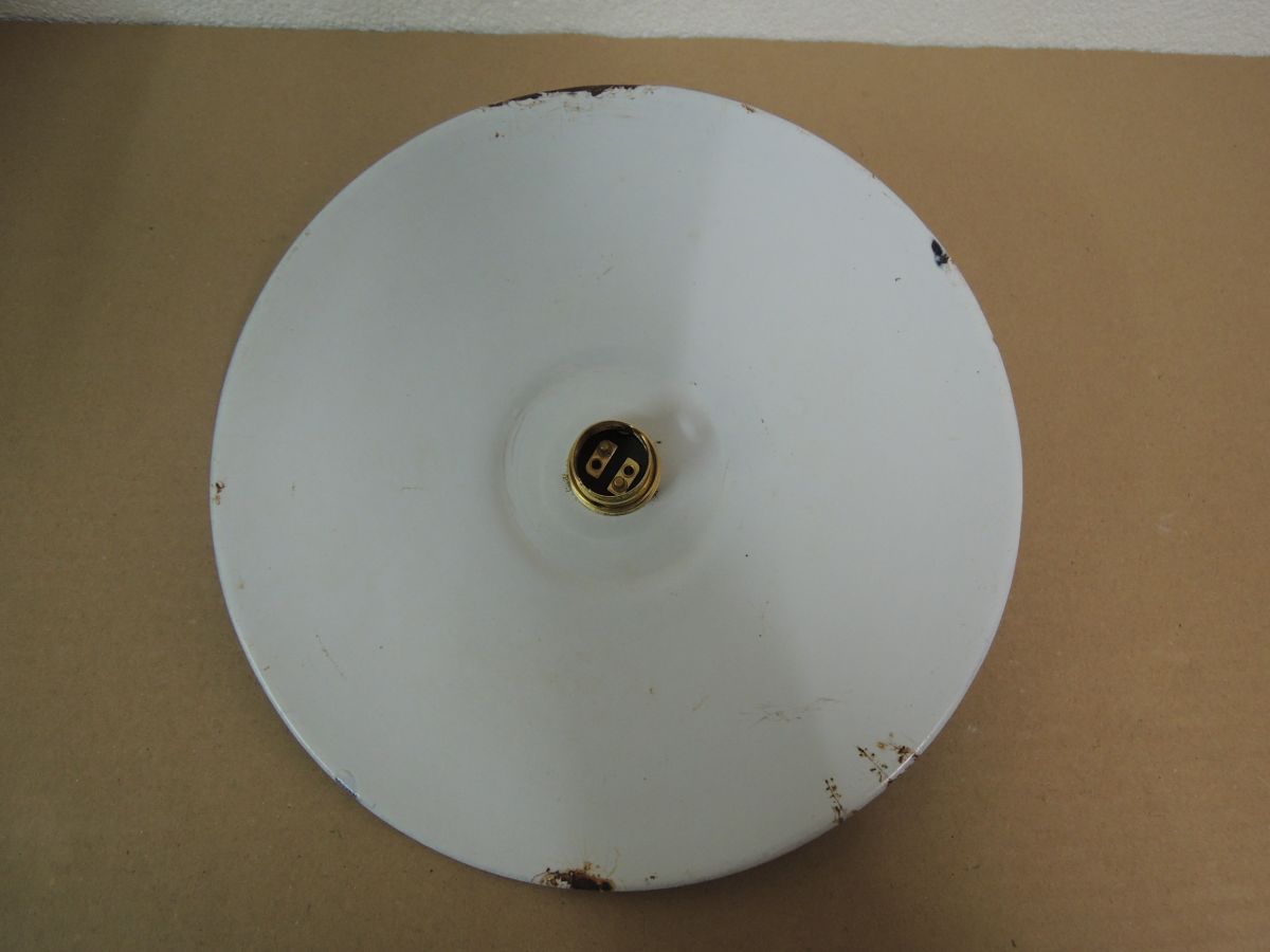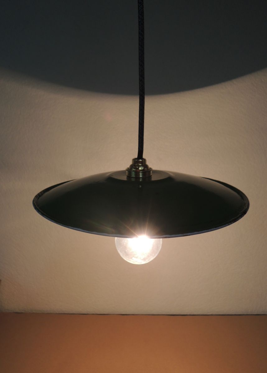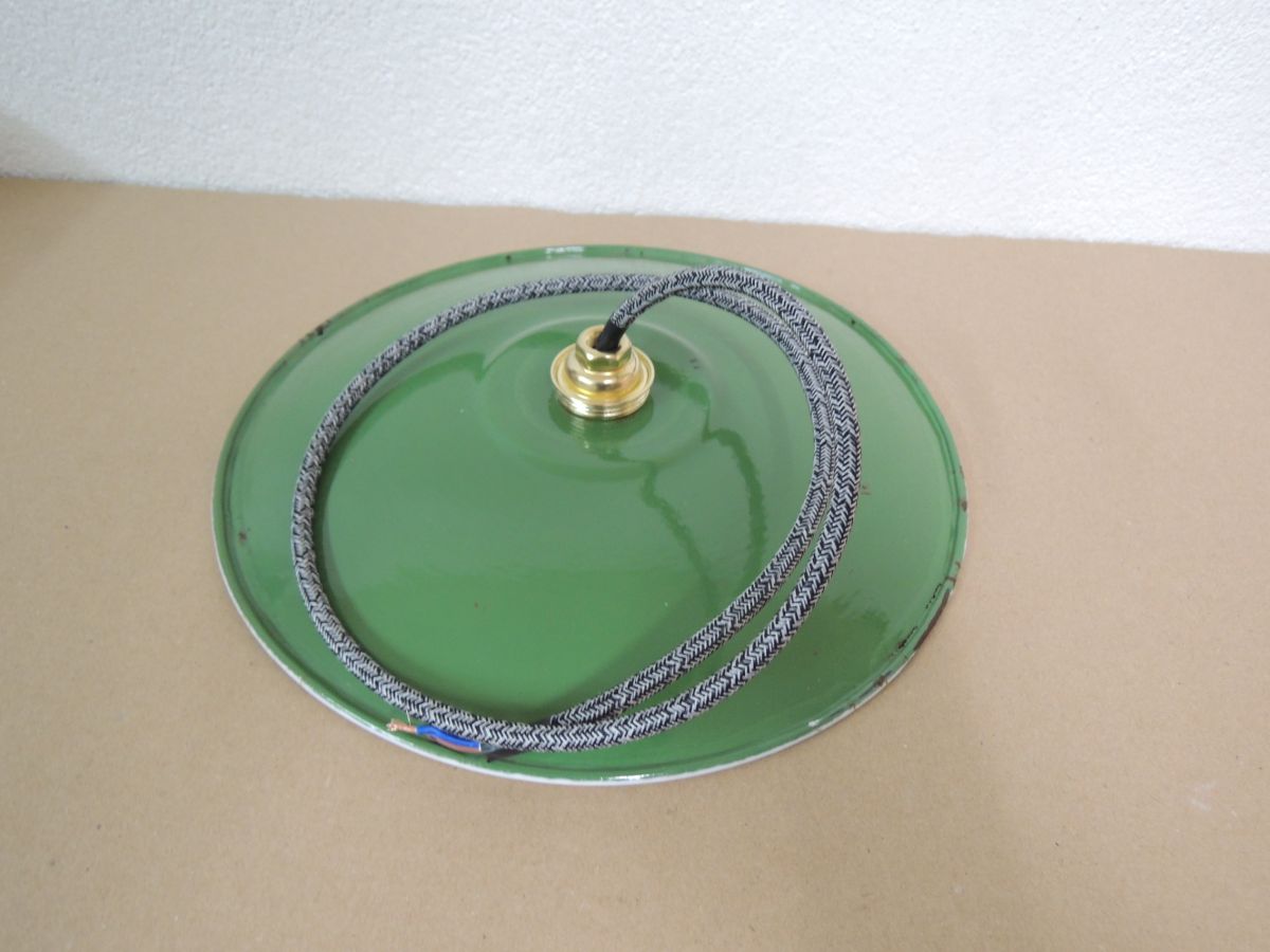 Suspension en tôle émaillée de diamètre moyen (24 cm), éclats sur l'émail et traces d'oxydation, douille à baïonnette type B22, câble tissé 60 cm