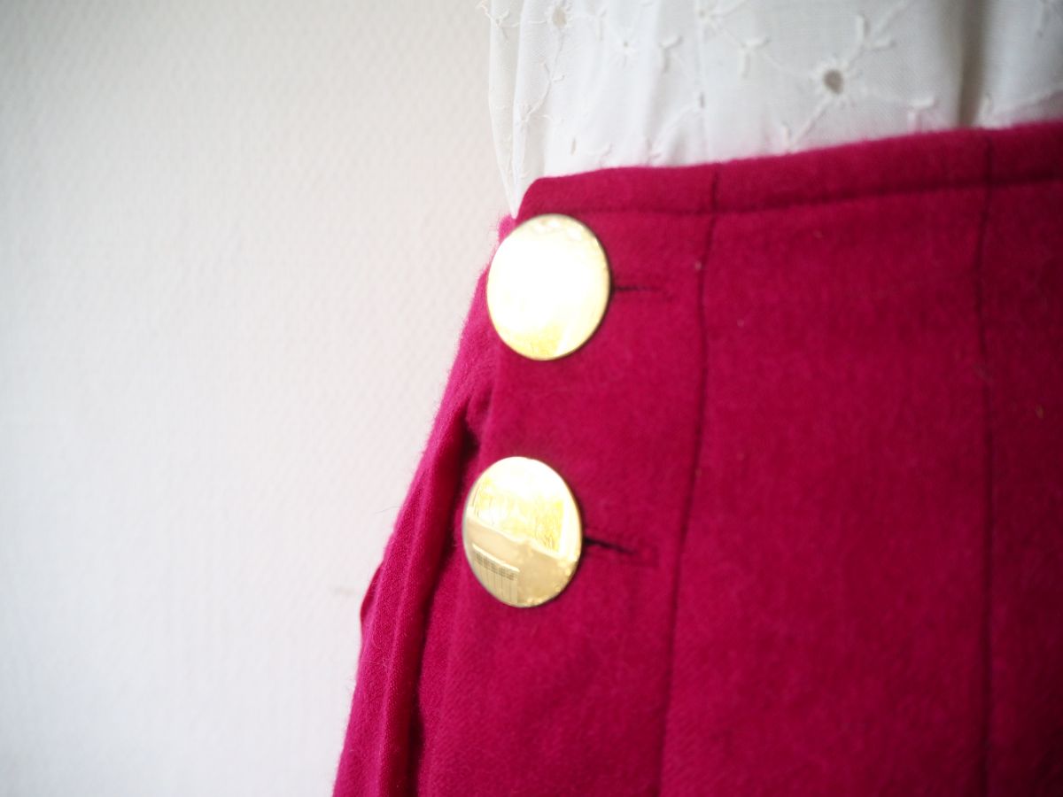 10 gros boutons dorés sur le devant, façon matelot. Ce ne sont pas des boutons décoratifs, il faut les déboutonner pour enfiler la jupe.
