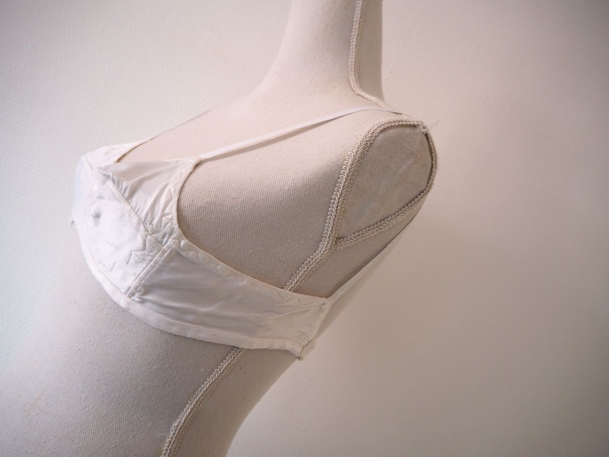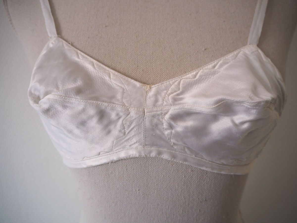 Superbe soutien-gorge en satin de soie blanc nacre, forme brassière sans armature et aux bonnets pointues typiques des années 1940/1950.
