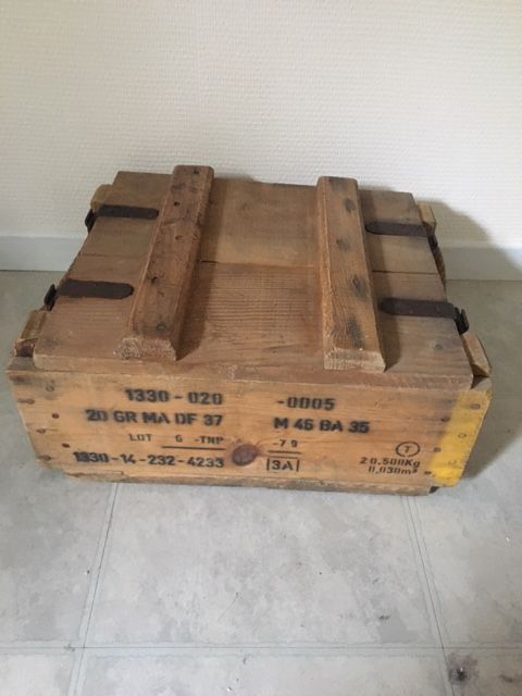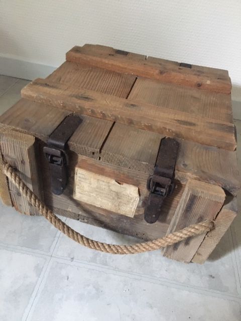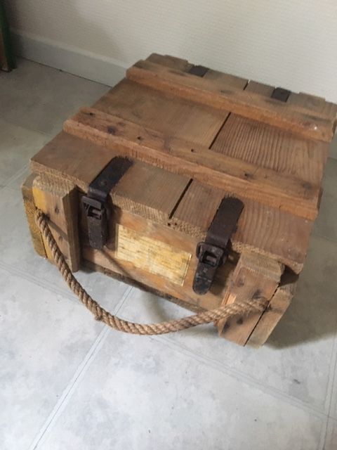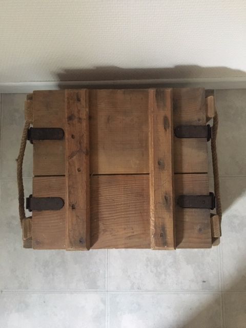 Caisse à munitions en bois avec poignée en corde et fermoirs en métal.