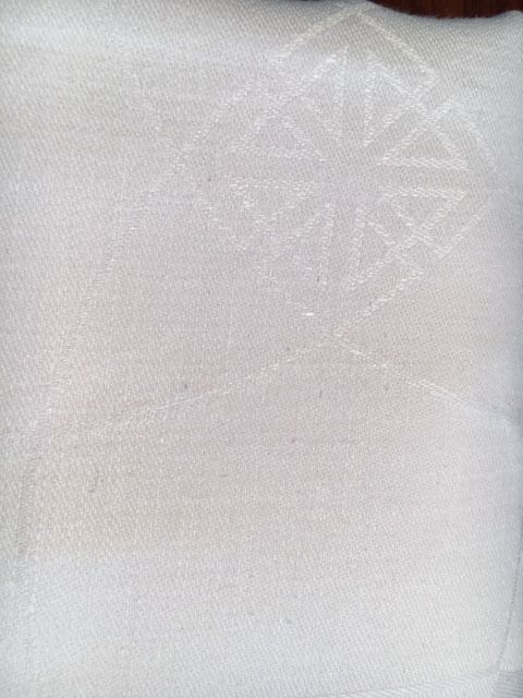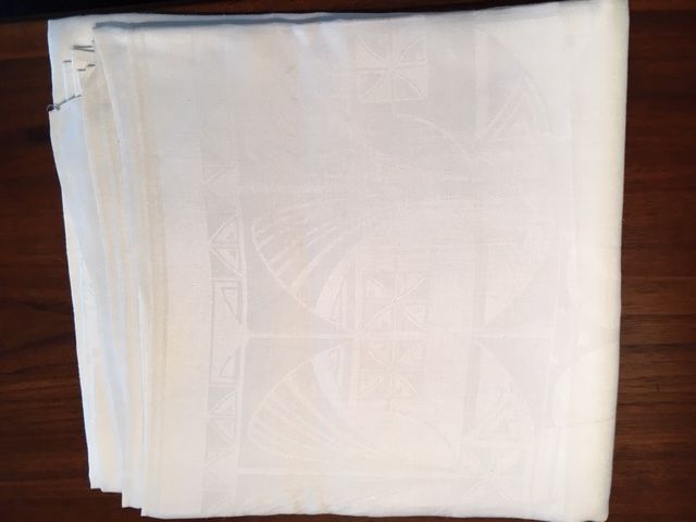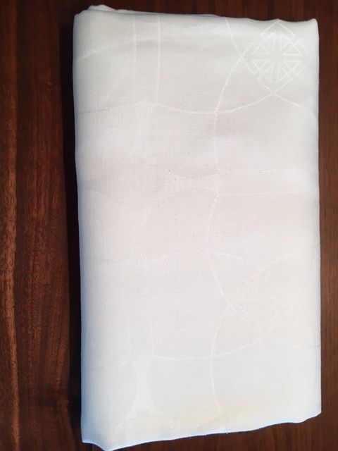 Grande nappe en lin blanche. Très belle tenue. Décore avec élégance une table de fête. (10-12 personnes environ)