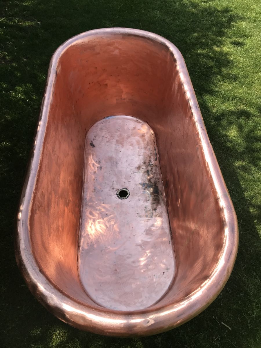 Jolie baignoire en cuivre étamé entièrement réalisée et repoussée à la main, en cuivre rouge pleine épaisseur.