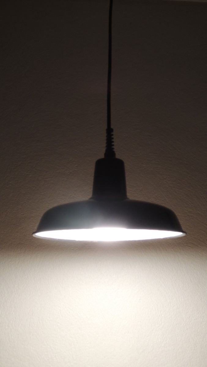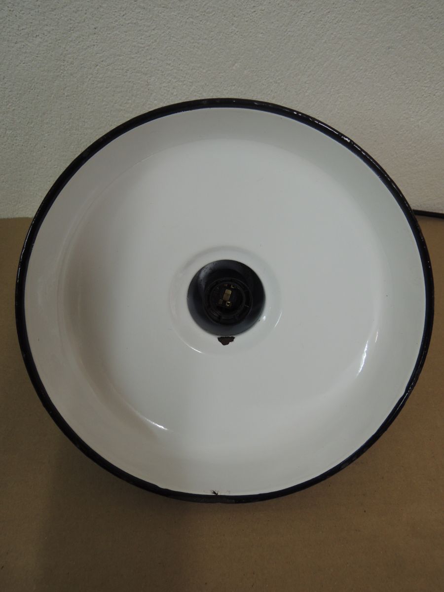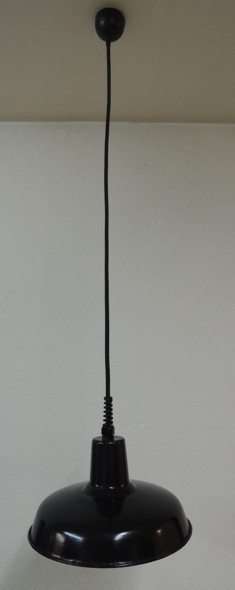 Petite suspension originale par ses dimensions (diamètre 26 cm), tôle émaillée noire en bon état avec quelques éclats sur émail. Electricité refaite : douille à vis type E27 et câble tissé noir neufs. Pavillon en plastique noir. 2 unités disponibles (prix indiqué pour 1 pièce)