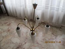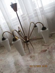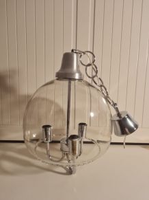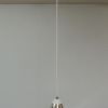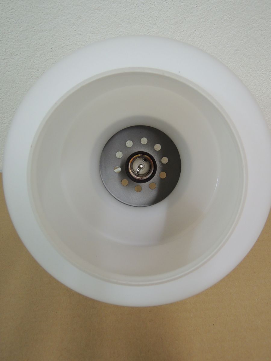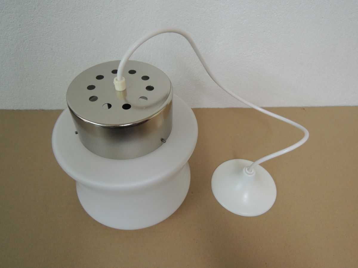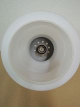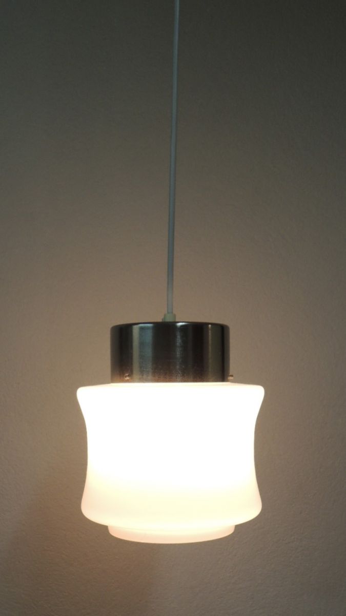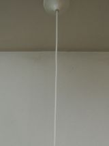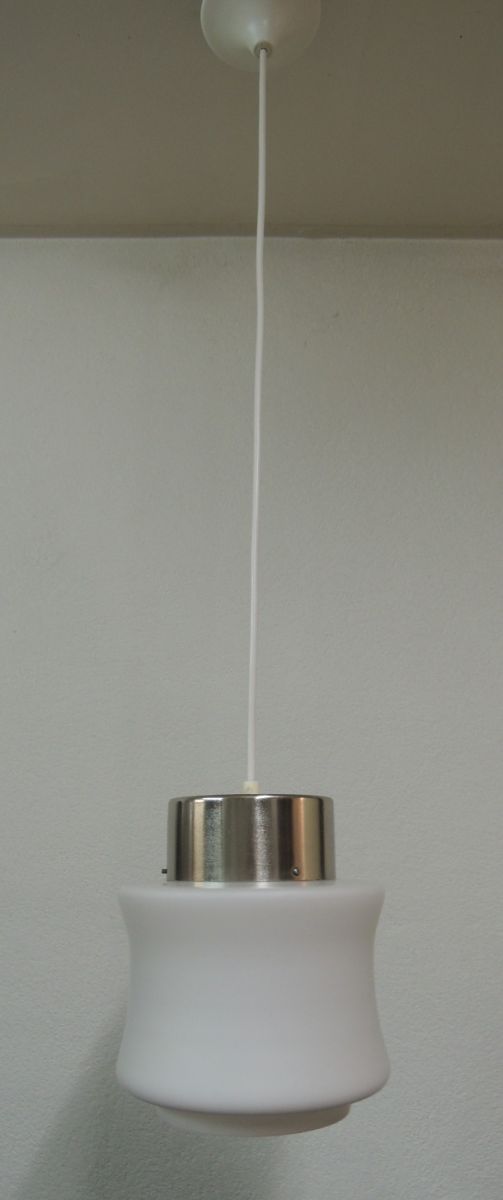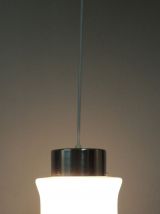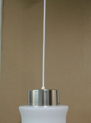 Suspension en verre en opale banc mat et chrome, électricité révisée (câble neuf de 70 cm), douille à vis type E27 (d'origine avec base céramique et fût bakélite). Pavillon en métal blanc.