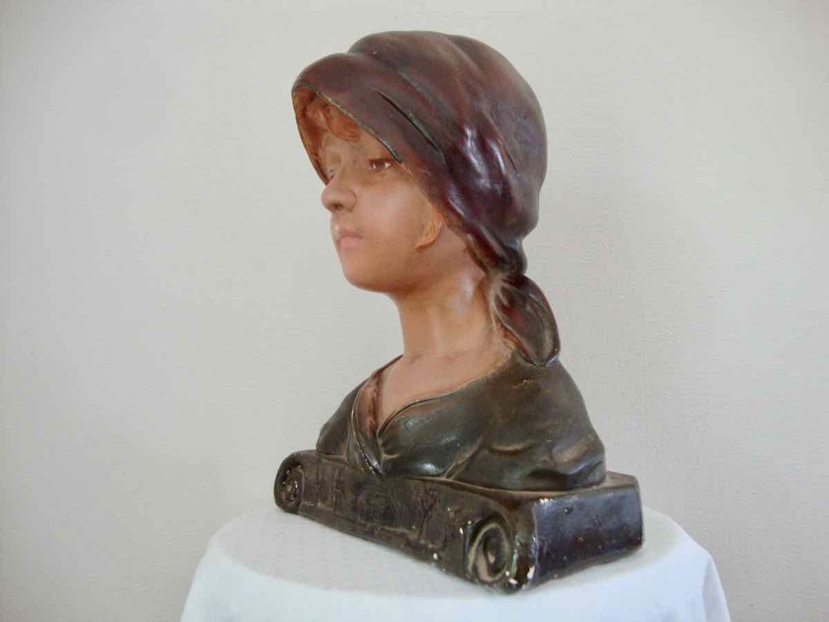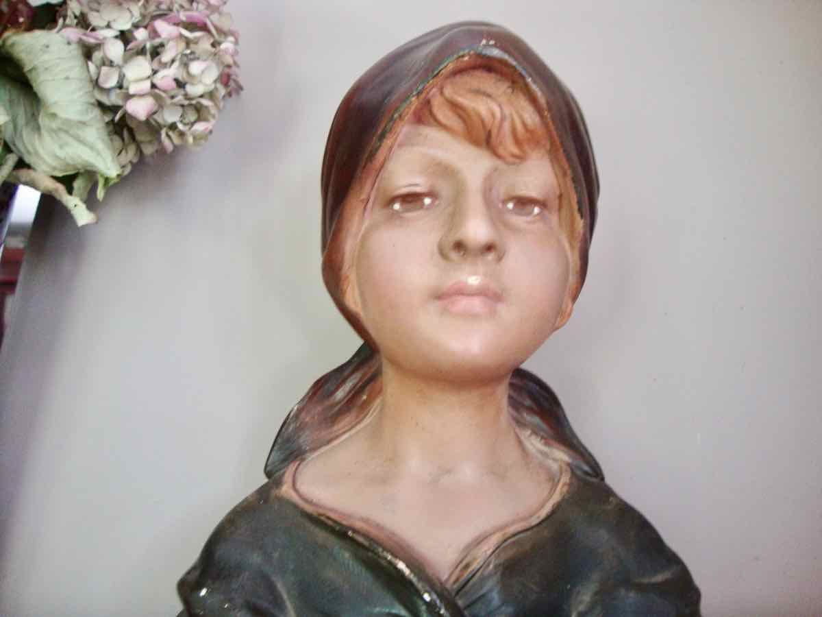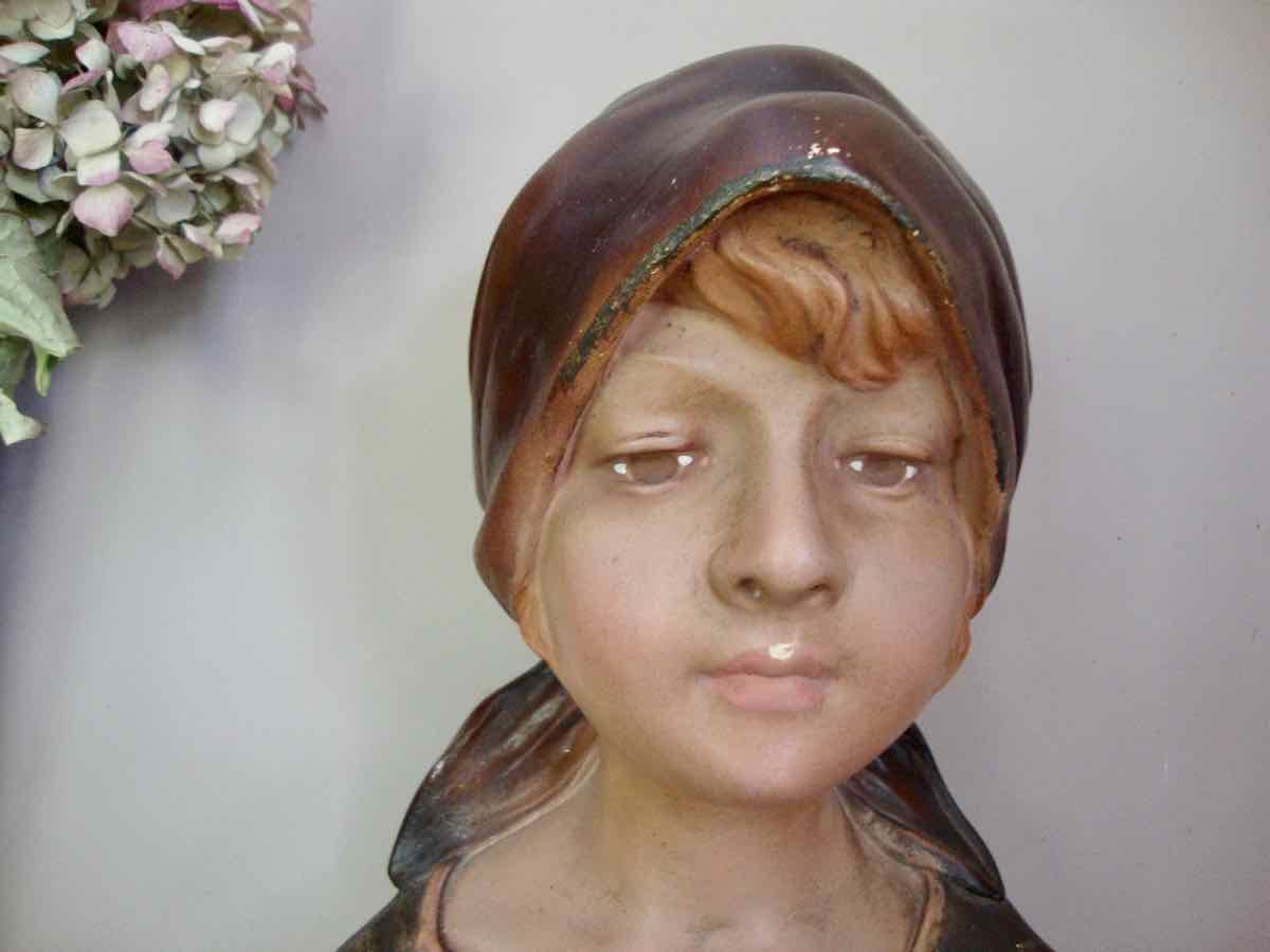 Buste de très jolie fillette réalisé en plâtre polychrome datant des années 1920 portant le numéro « 297 Nardi Editeur » gravé au verso. Quelques légers éclats de peinture n’enlèvent rien à son charme.