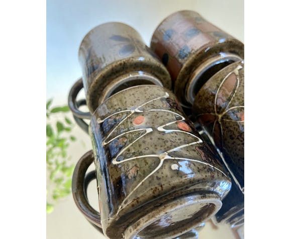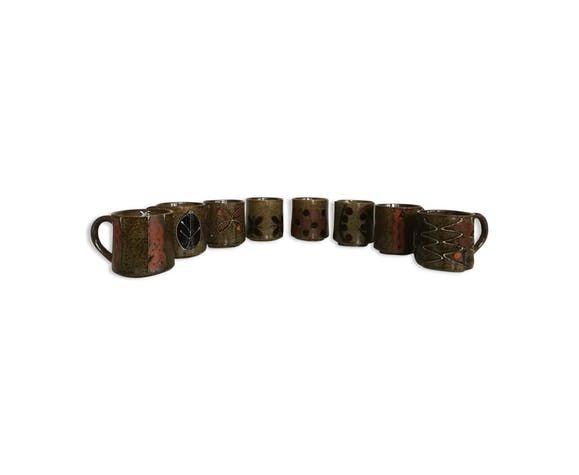 Ensemble de 8 tasses vintage en grès, émaillées. Style scandinave avec motifs floraux et autres, couleur vert kaki, orange et marron. Très déco et en bonne état.