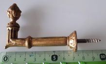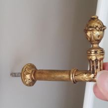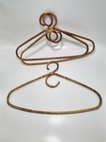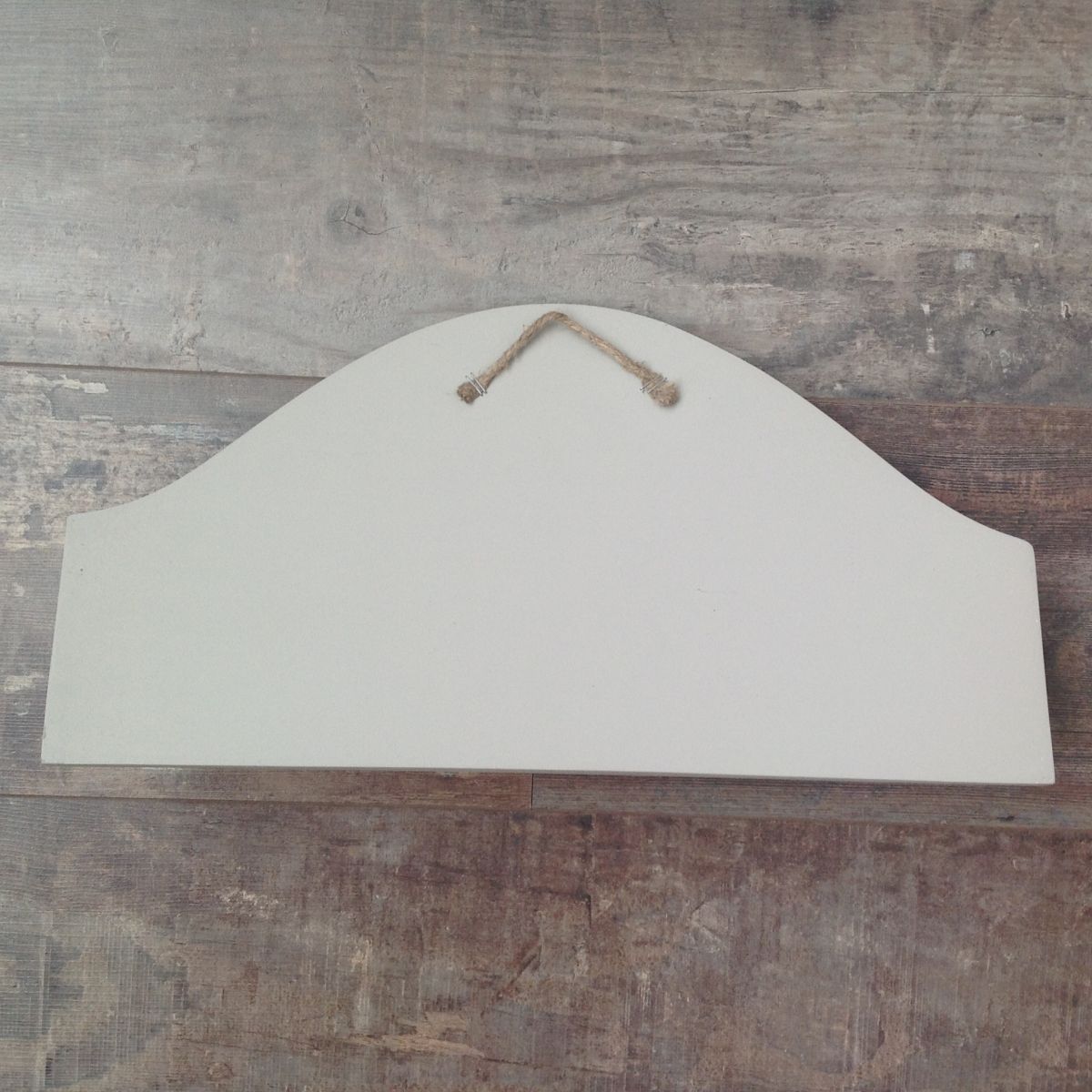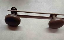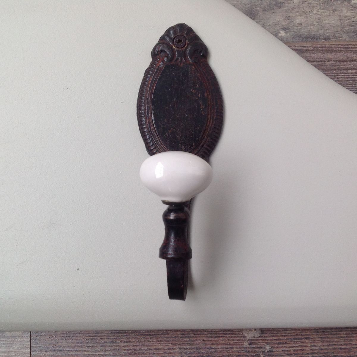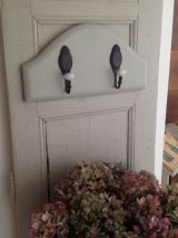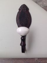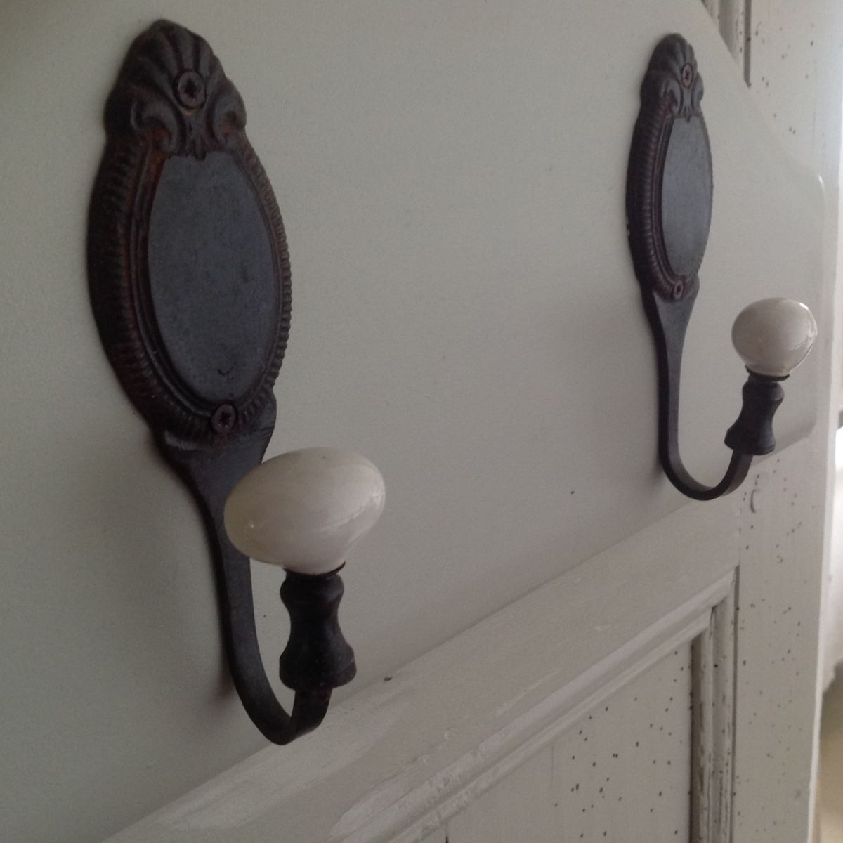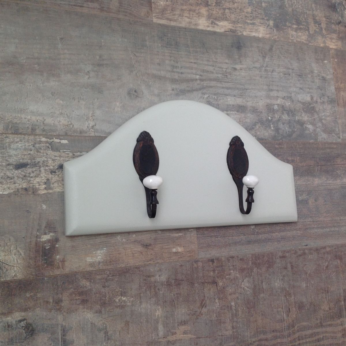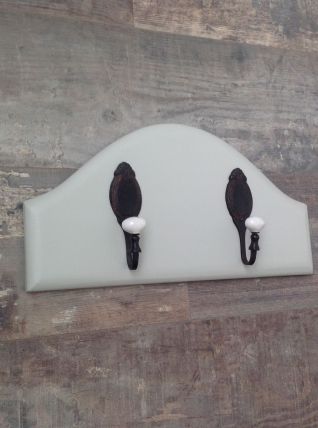2 accroches en métal effet rouillé et boutons de porcelaine blanche sur un support en bois gris en forme de chapeau de gendarme.