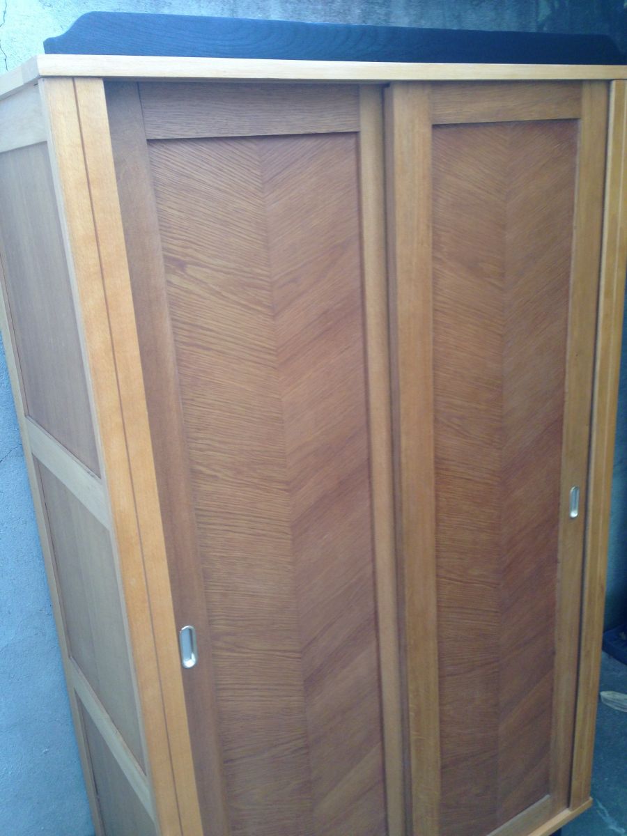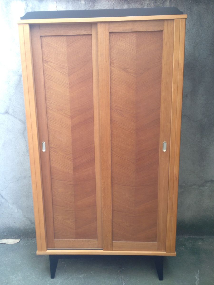 Jolie armoire en placage ciré chêne clair. Le fronton, le piètement et l'étagère ont été peint en noir.