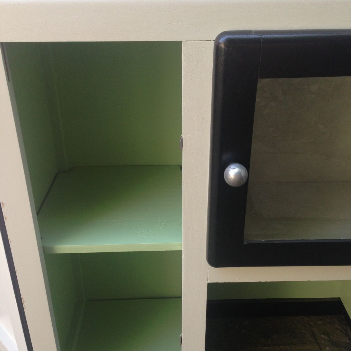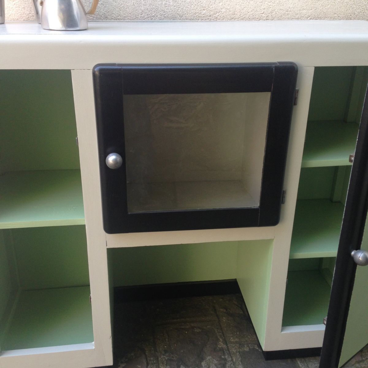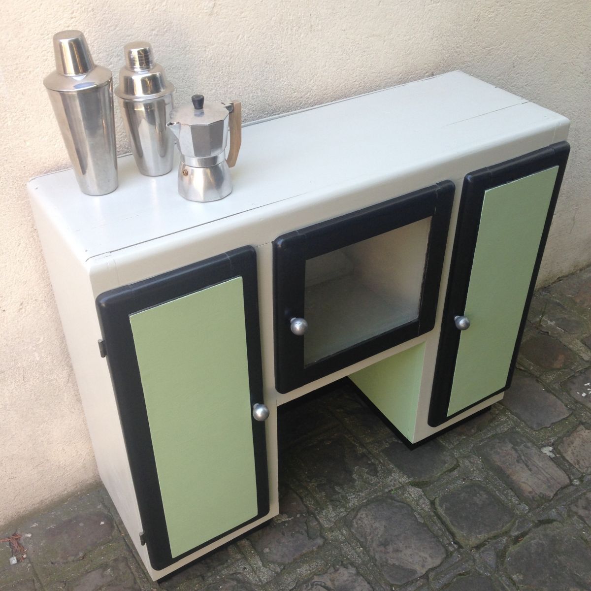 Repeint en vert amande et noir .Les couleurs mettent bien en valeur ses lignes 50.IL est constitué de deux placards latéraux et d'une partie centrale vitrée.Très jolies poignées boules