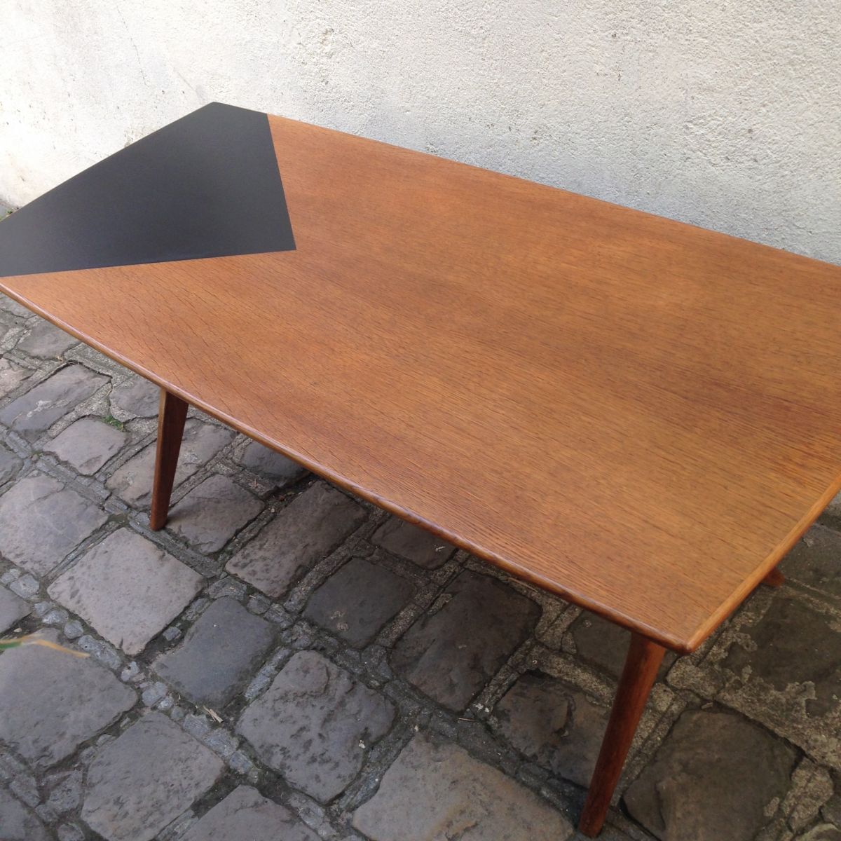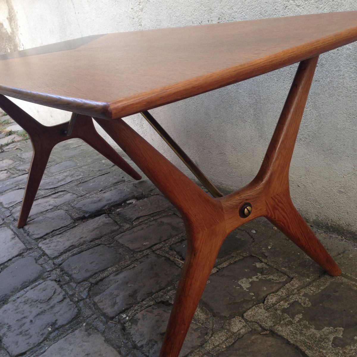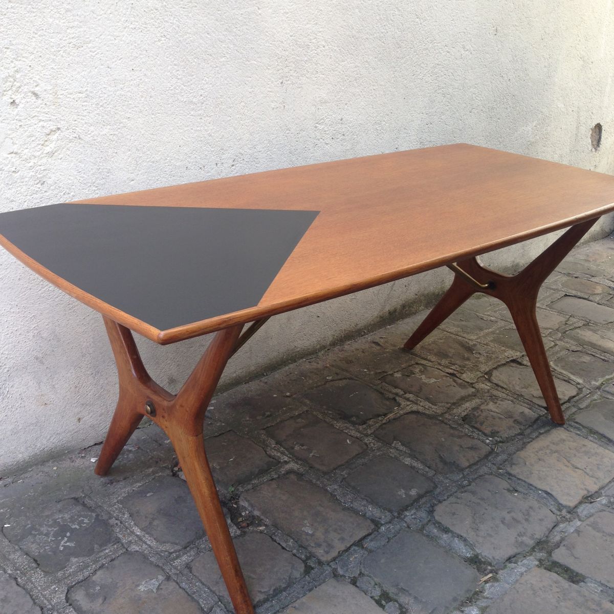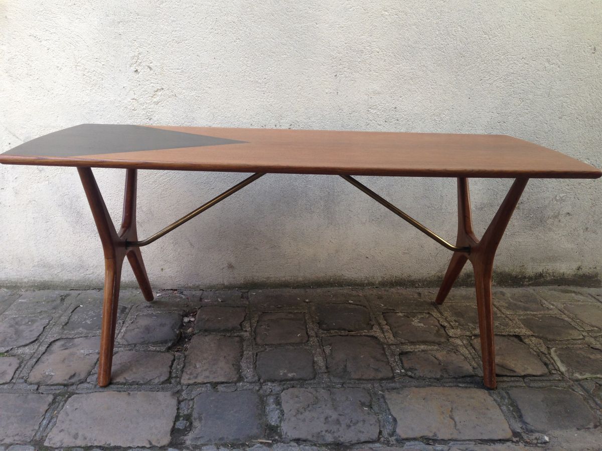 La table est en palissandre,entretoise et finitions en laiton.Le plateau qui était abimé et a été restauré et peint .