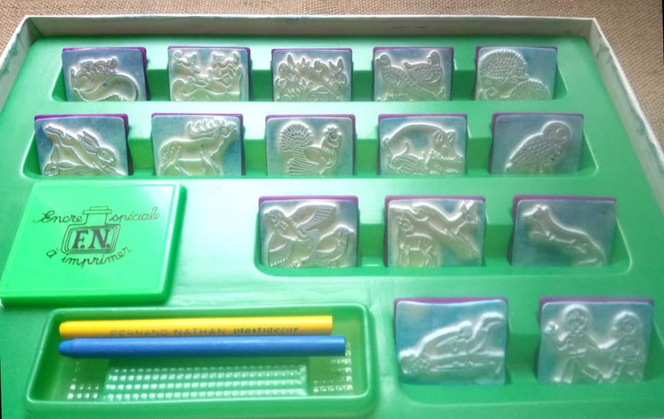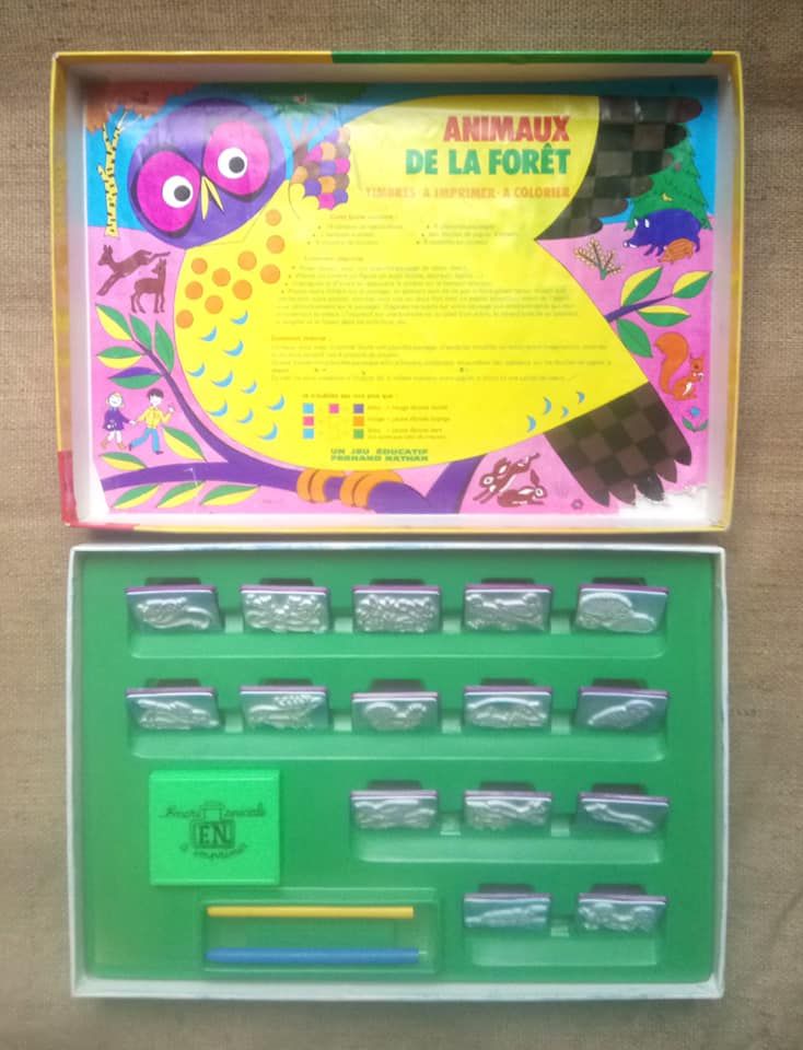 La boîte contient les 15 tampons en caoutchouc d'origine ( 2 de personnages et 13 d'animaux), la boîte tampon-encreur (à recharger) et la notice à l'intérieur du couvercle.