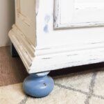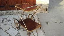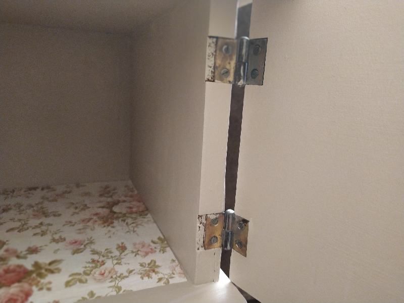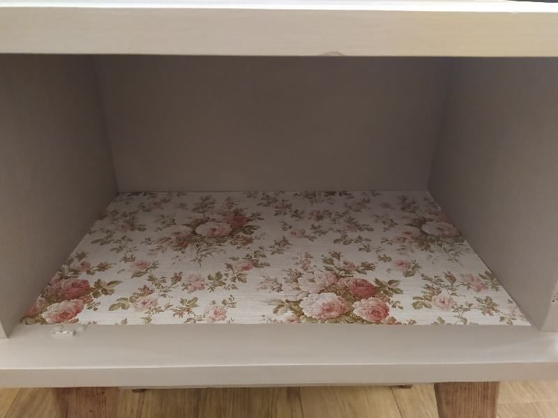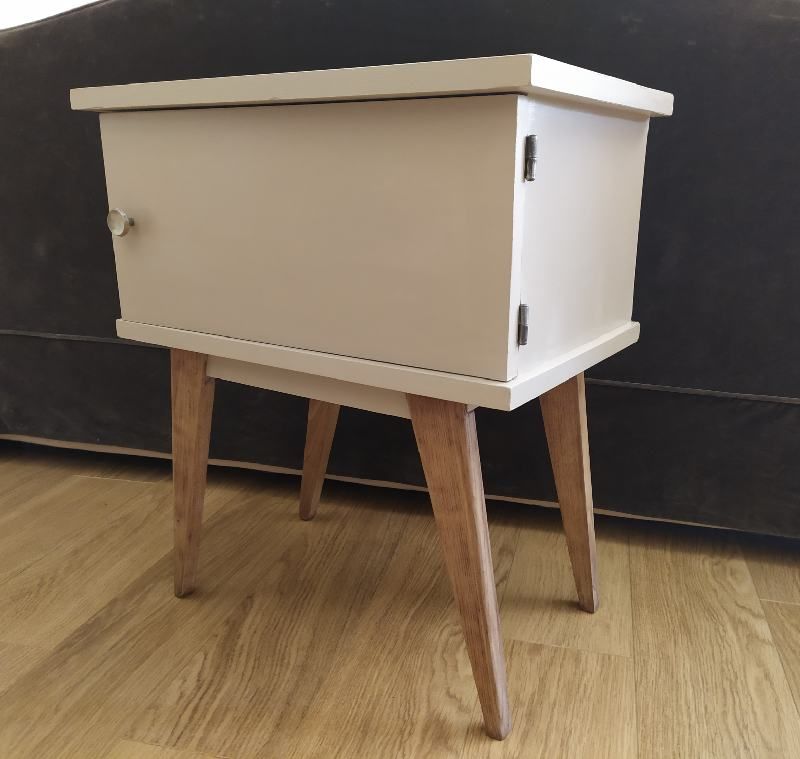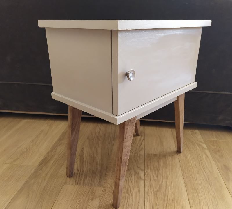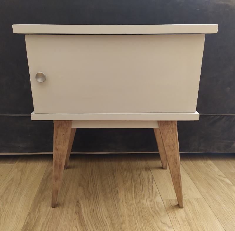 Petit chevet des années 50 peint en couleur beige tourterelle, pieds compas. Il persiste des traces du temps évidemment. À l'intérieur un papier peint rétro habillé la niche.