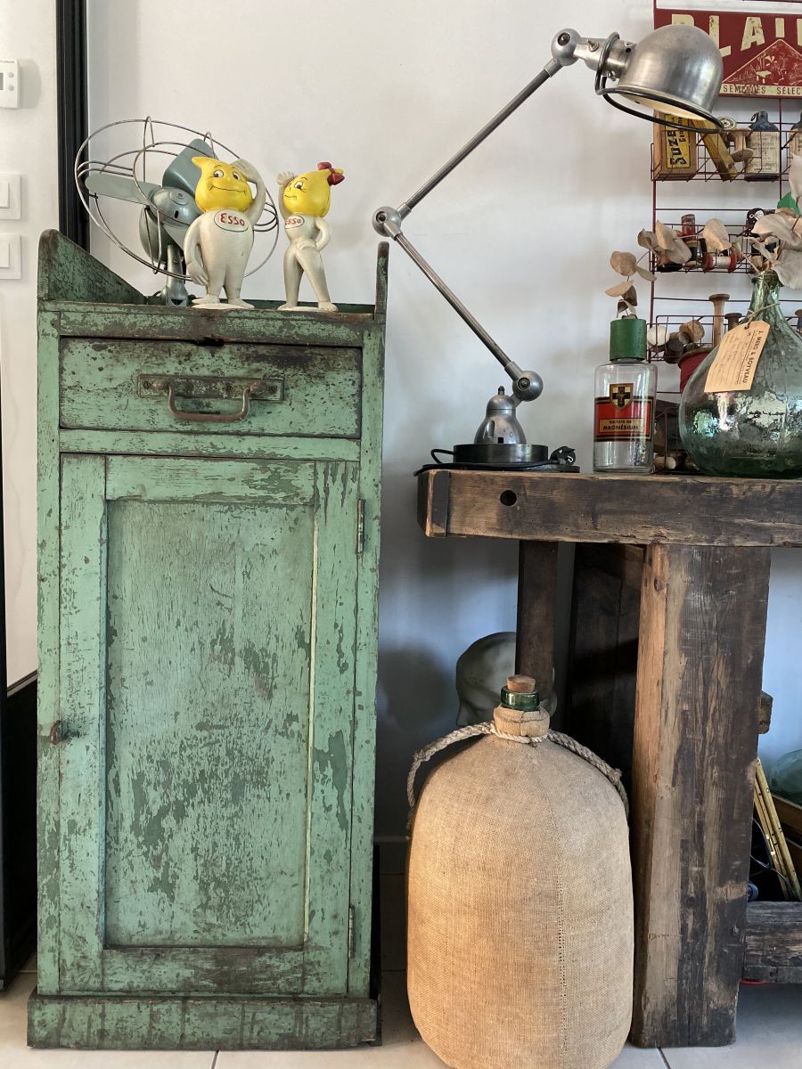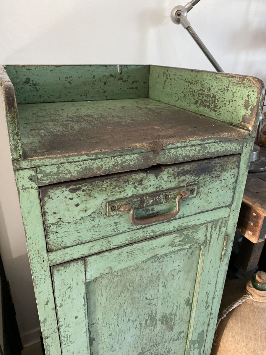 Très beau meuble de métier en bois dans son jus avec une jolie peinture écaillée bleue vert qui fait tout son charme. Il possède 1 tiroir et une partie rangement avec des étagères. Le meuble est en bon état général seul le bas du meuble présente des traces d’usures sur l’arrière. Très belle pièce pour une déco industrielle !