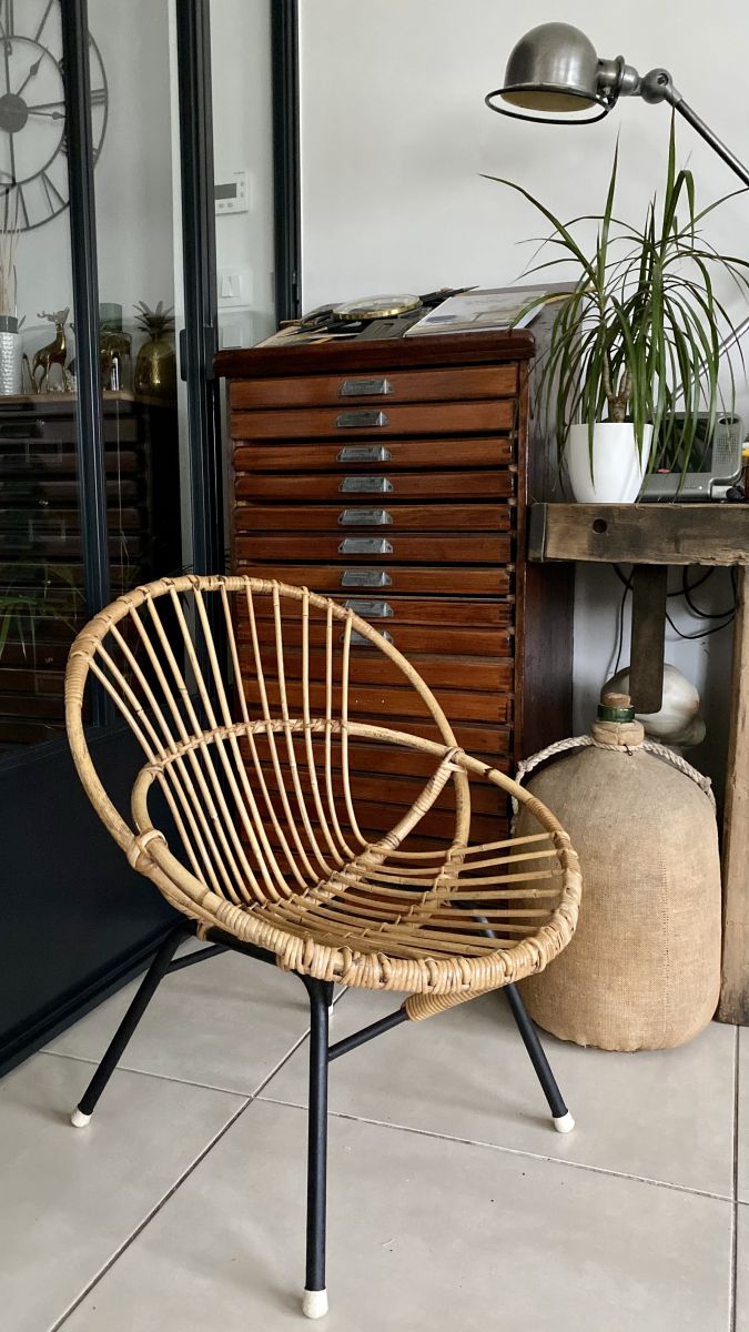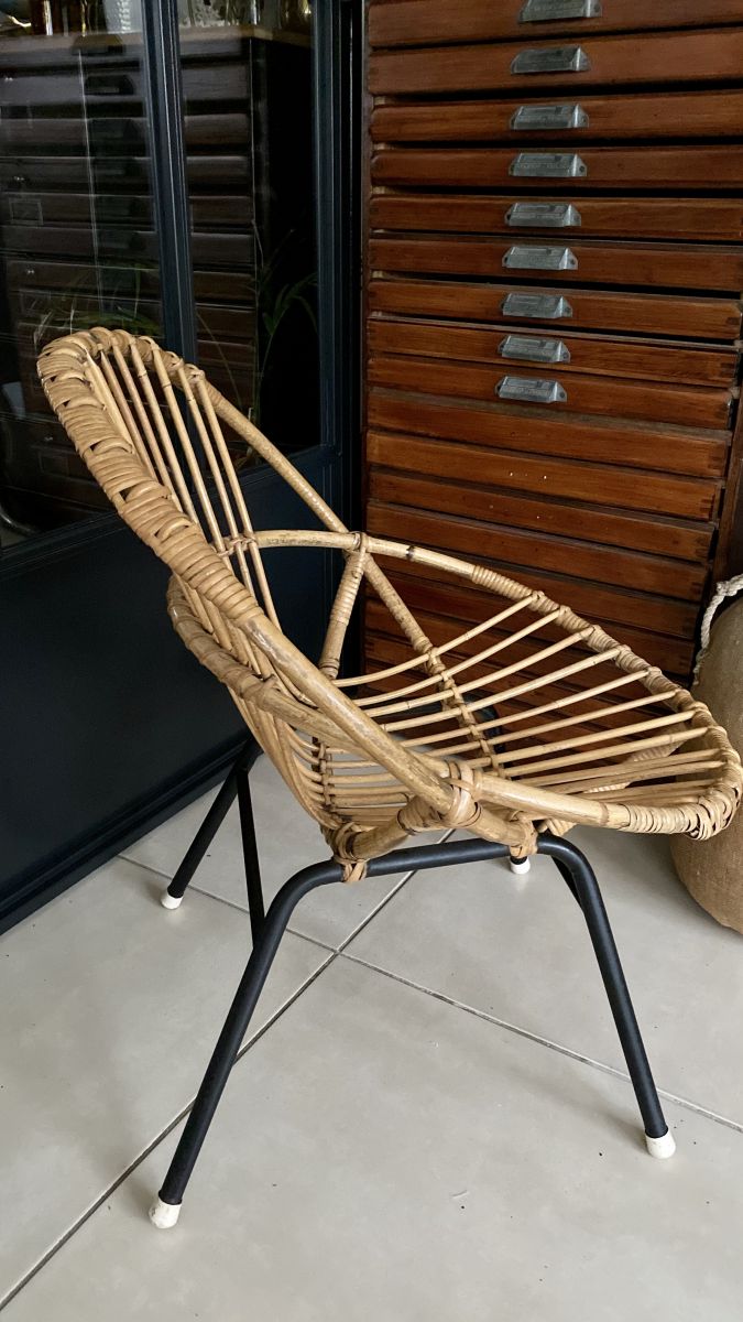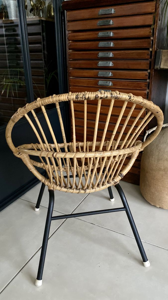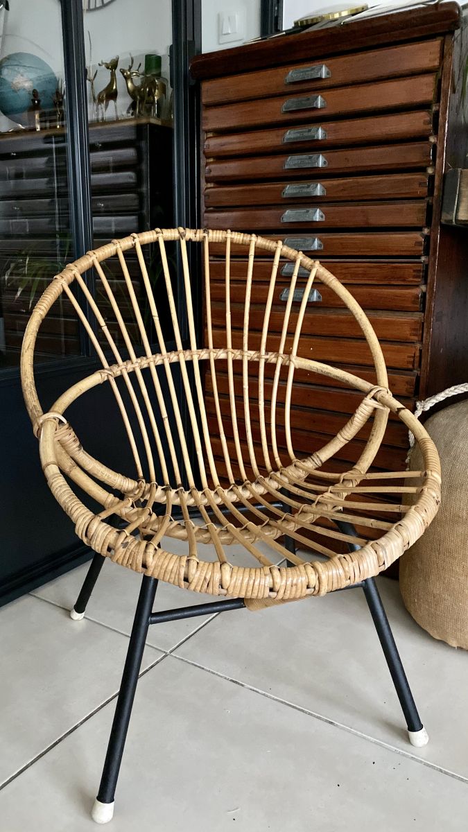 Très joli fauteuil rotin vintage des années 60. Pieds metal noir. Très bon état vintage (pas de brins cassés). Modèle adulte pas trop corpulent. Hauteur assise 35cm. Hauteur 70cm. Largeur 55cm.