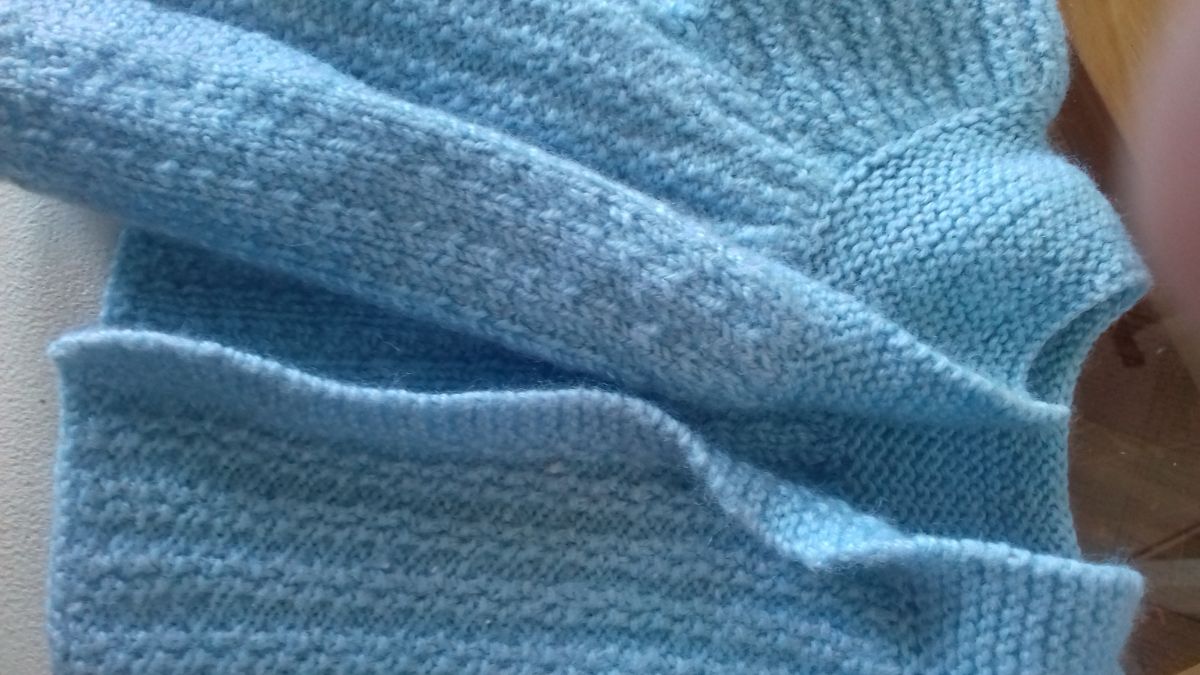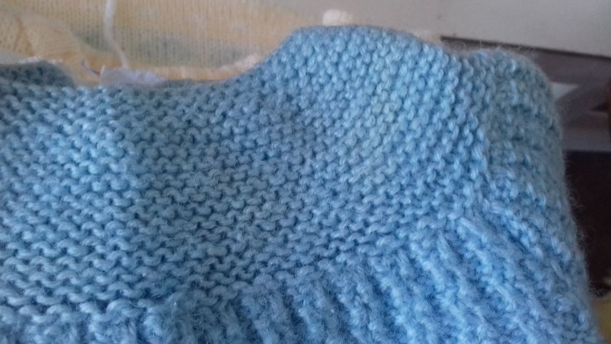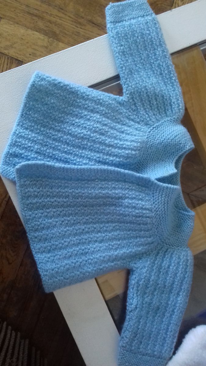 Gilet bleu naissance en laine, fait main. Manches longues, ne se ferme pas.