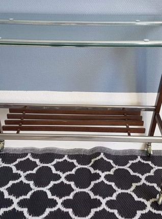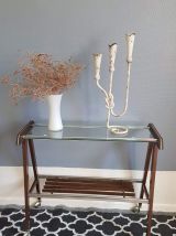 desserte vintage plateau verre et structure bois et métal sur roulettes