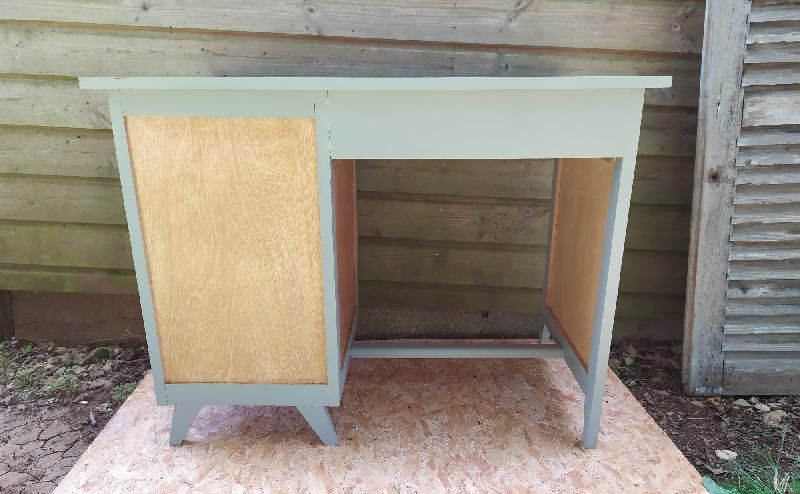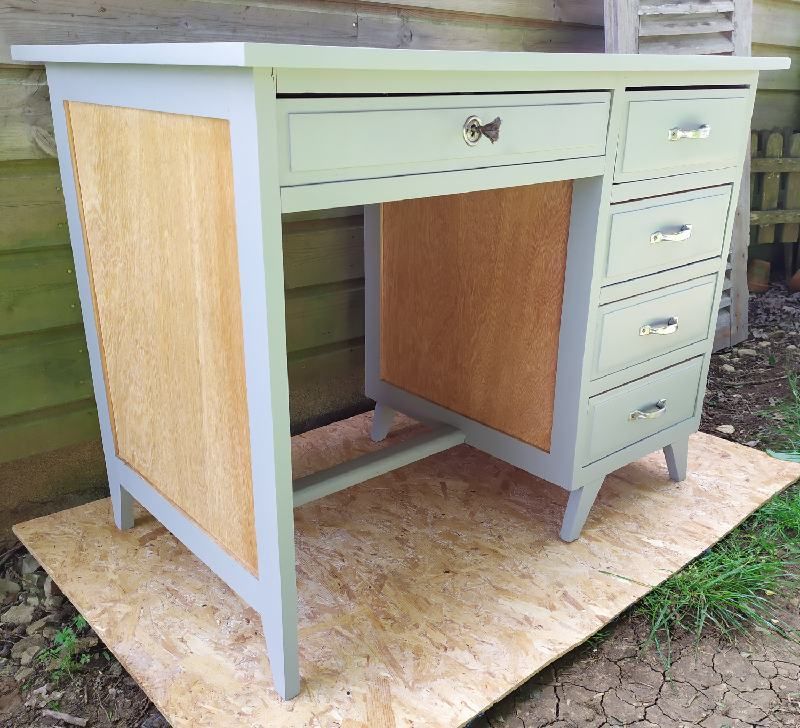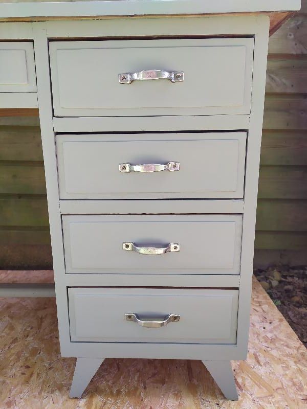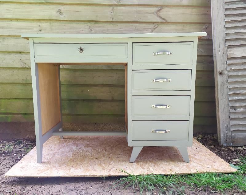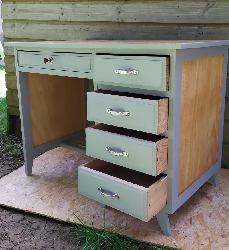 Bureau des années 70; peinture Toscane(gris-vert) petits pieds compas. Un tiroir comporte des petites tâches en l intérieur sinon bon état général. Plateau ciré