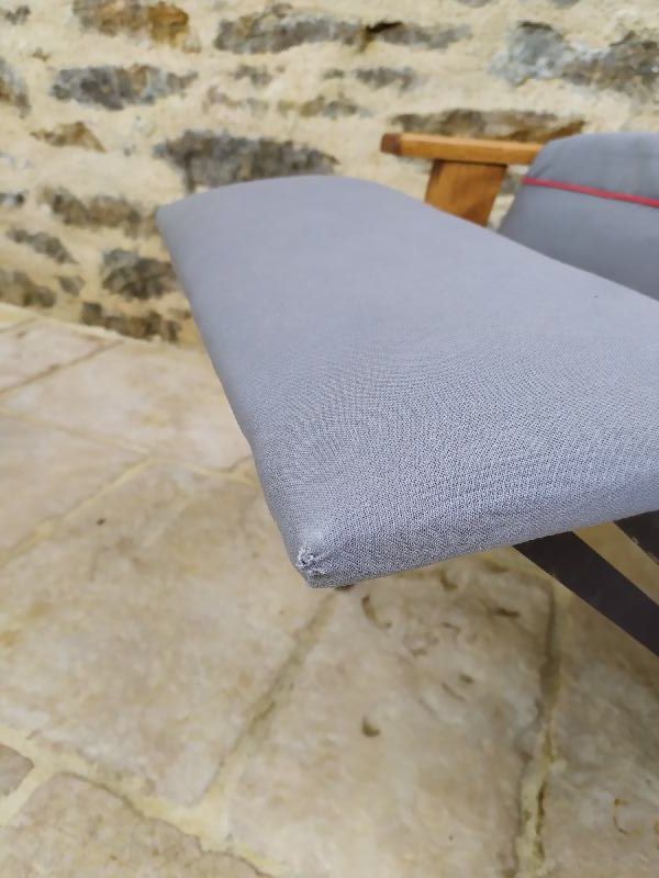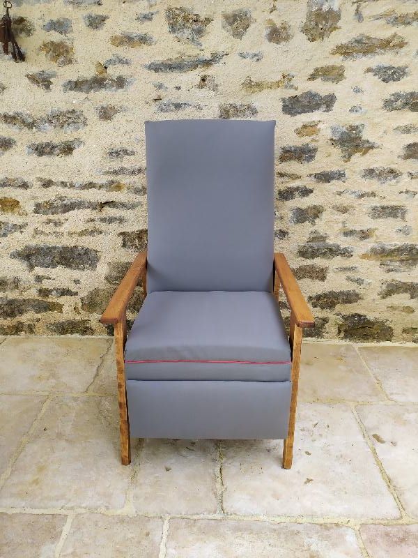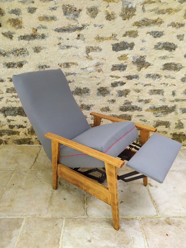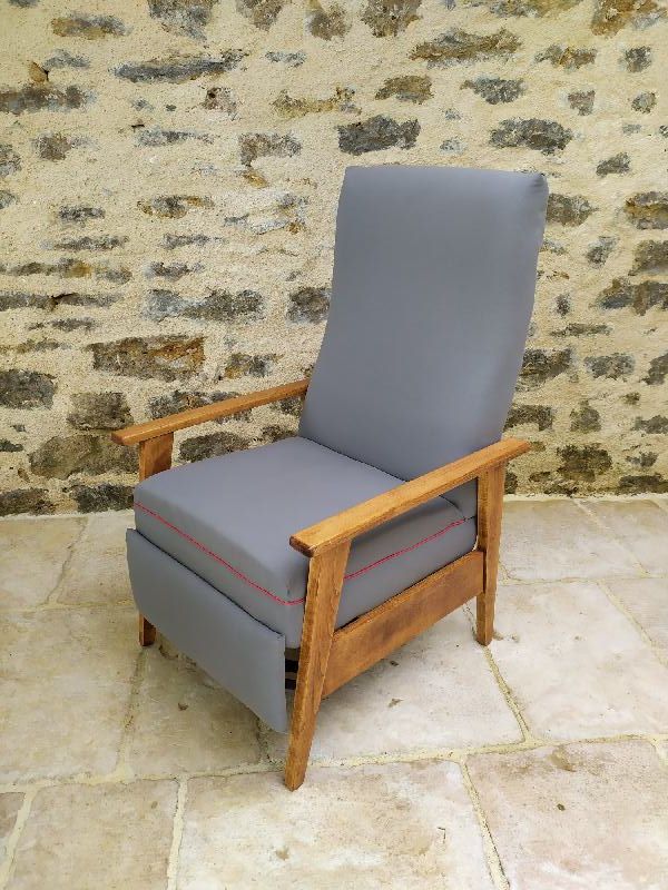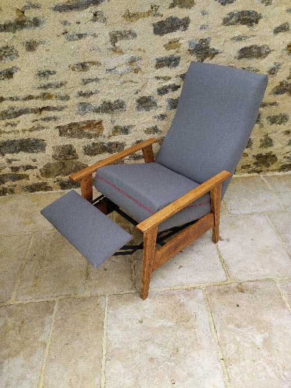 Fauteuil relax vintage, tissu gris., sans tâche. Le repose-pieds à un angle très légèrement abîmé.