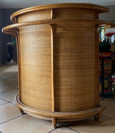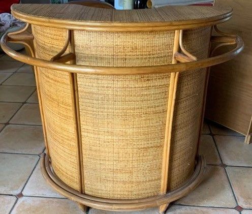 Très joli bar en rotin de forme arrondie, avec une étagère de rangement à l'intérieur.