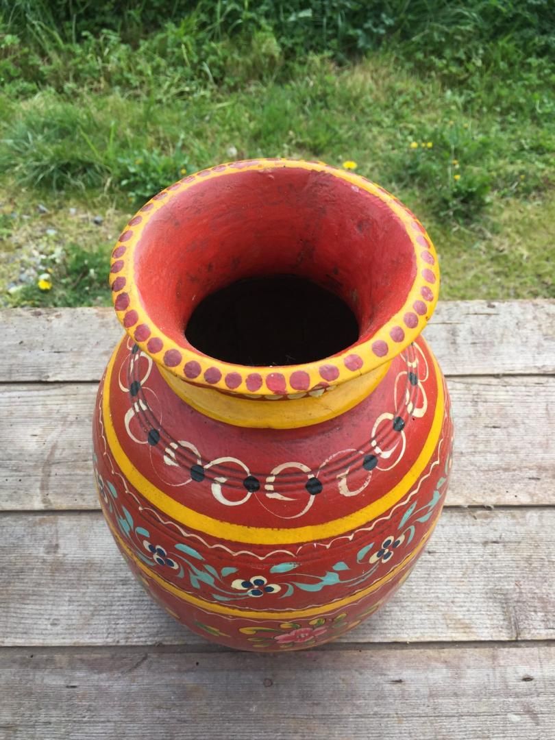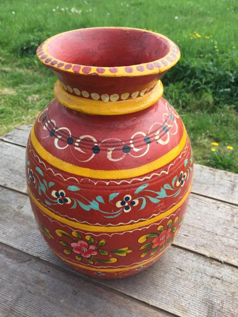 Vase en bois à motif fleurs peint à la main, esprit bohème. Artisanat des pays de l'Est probablement.