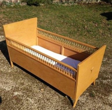 Véritable et magnifique lit de bébé vintage typique des années 50 avec son bois miel, son rotin et ses pieds compas.