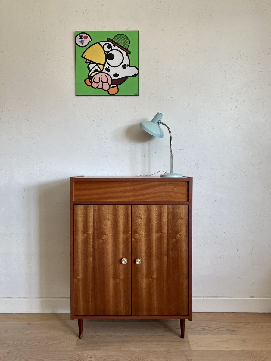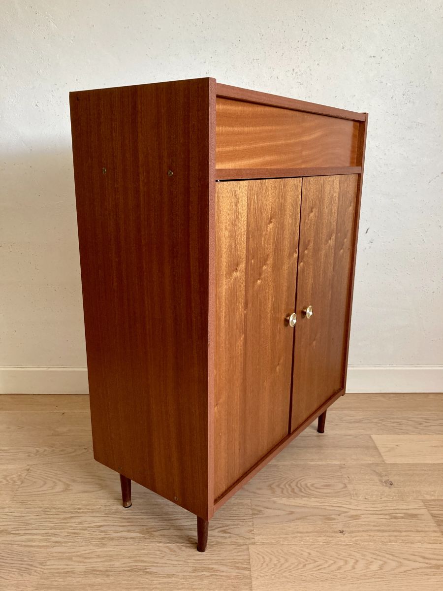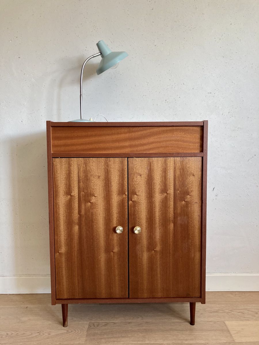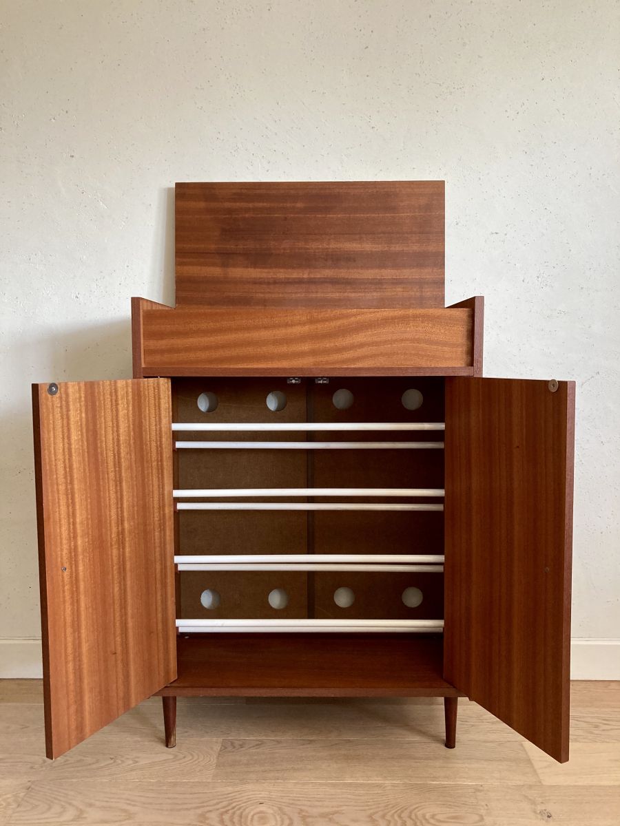 Meuble à chaussures vintage en placage de teck composé d’une partie basse fermée par deux portes battantes, réhaussée d’un coffre de rangement. Convient pour une quinzaine de paires de chaussures.