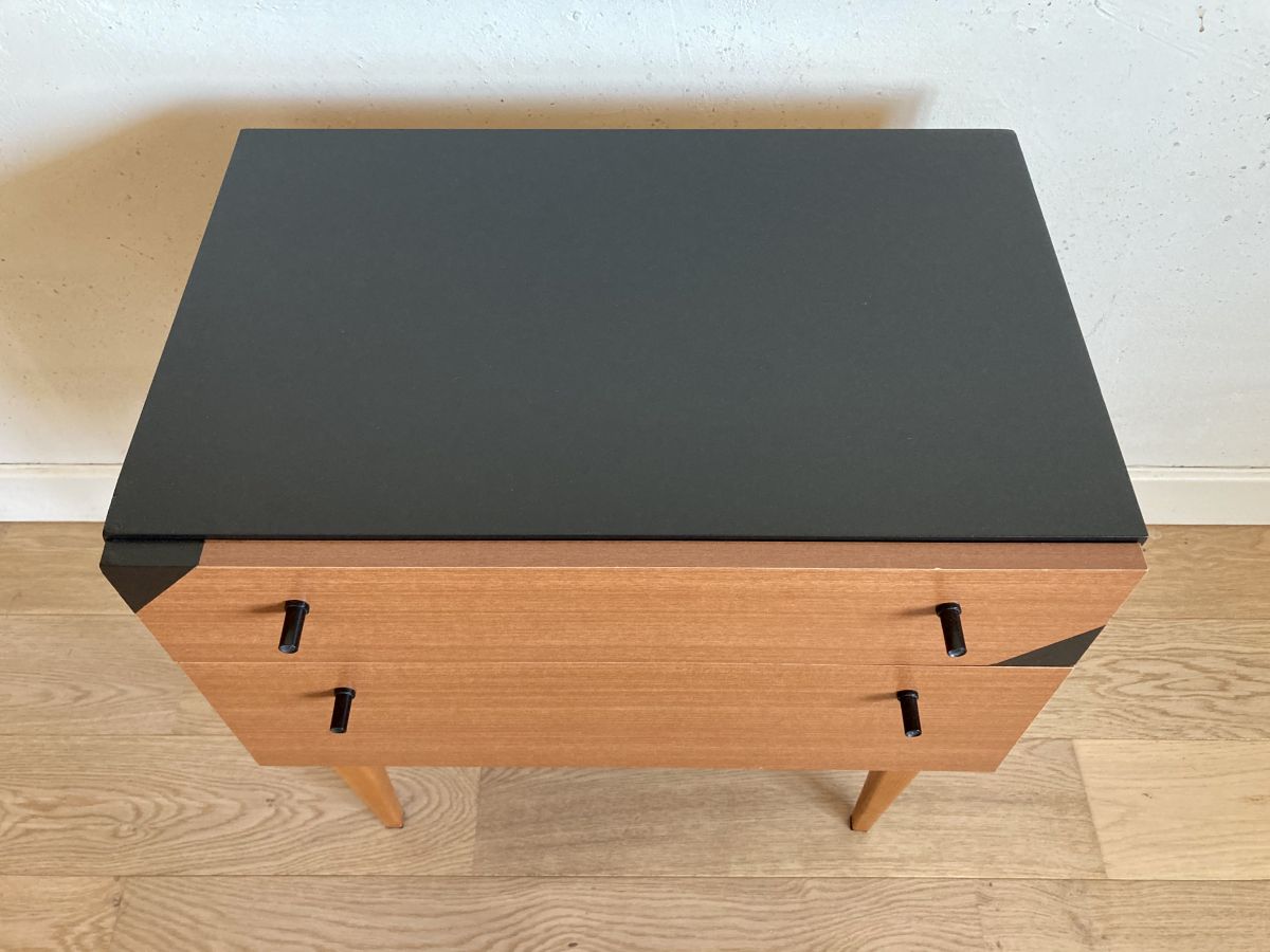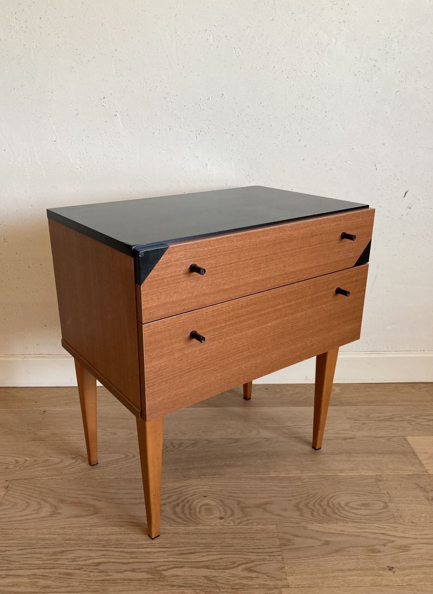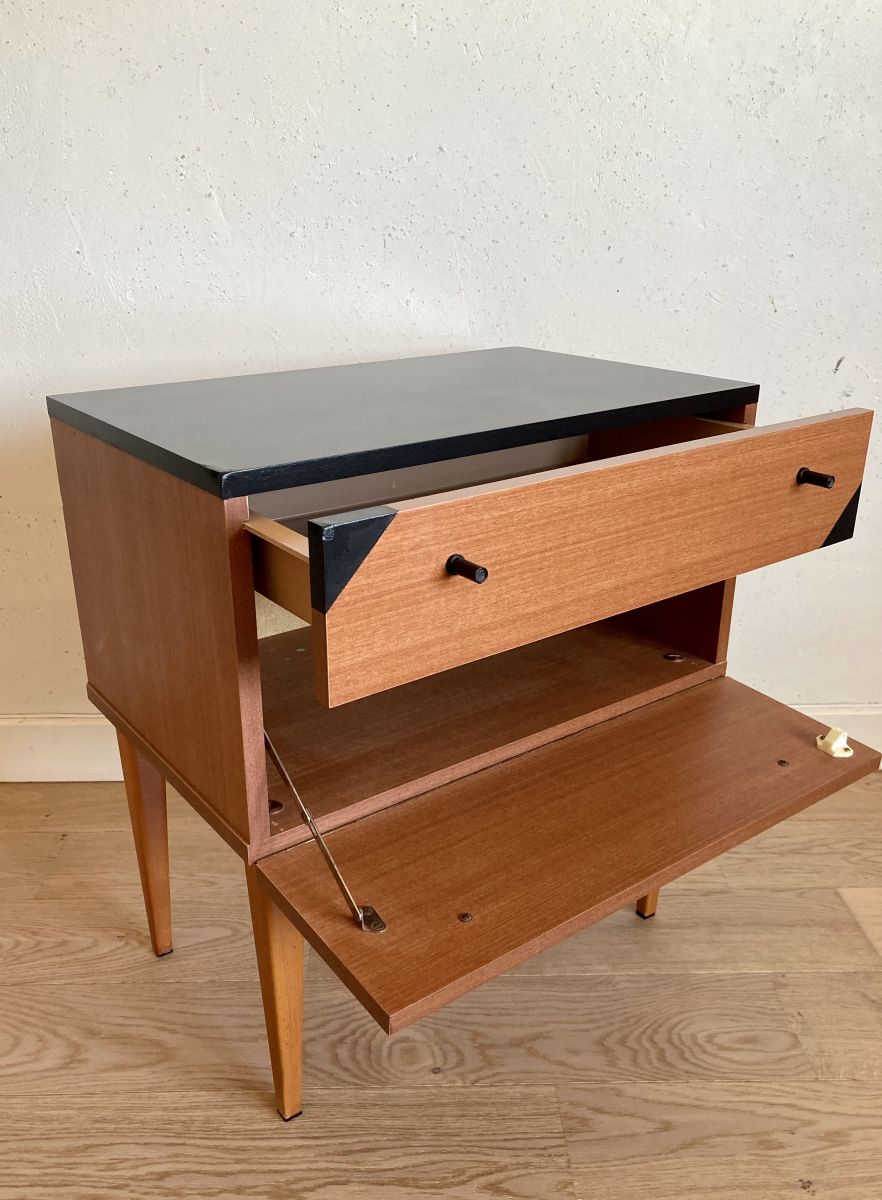 Table de nuit / chevet édité dans les années 60 par 3K Möbel, fabricant ouest allemand de mobilier. Ce meuble fait partie du programme 3K-multi, distribué notamment par la Samaritaine en France.